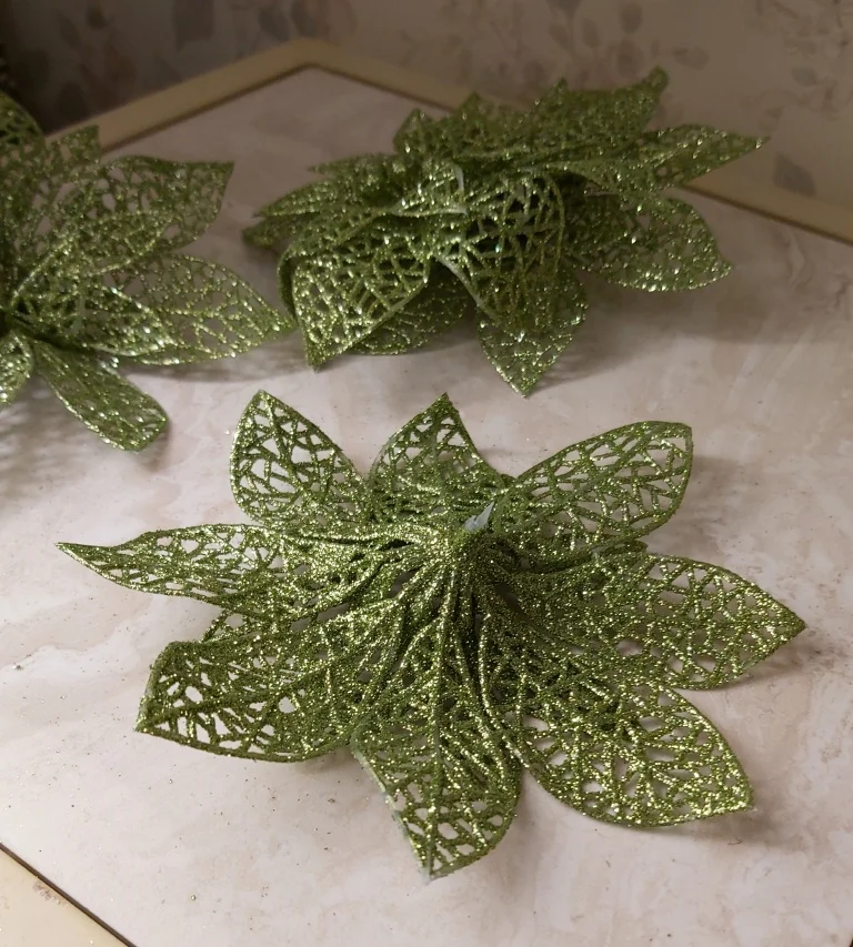 Зеленые цветы очень красиво блестят. На елке смотрятся оригинально.