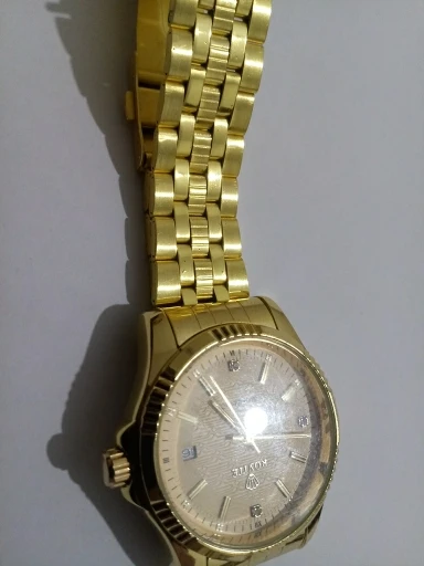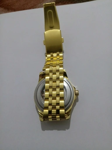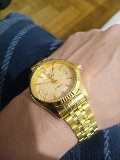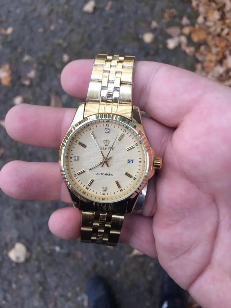 Много времени выбирал часы. И остановился на этих, из за того что цвет мне понравился. Хотя продавец в описании и предупредил что может немного отличатся. Но когда они пришли, то я немножко был " розачарован". Почему то цвет на циферблате похож, а сам браслет светло- латунный. Еще и какие-то точечки черные на браслете, как будто его красили в грязном помещении. Дата сама не перещелкивается. День не подзавел, полтора часа опоздания. На последнем фото видно на браслете под краской мусор.