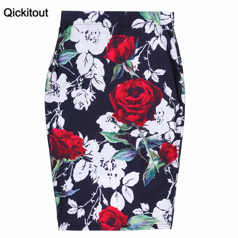 Юбки Женские Qickitout, черные, с принтом, с высокой талией, с красными и белыми розами, 2016