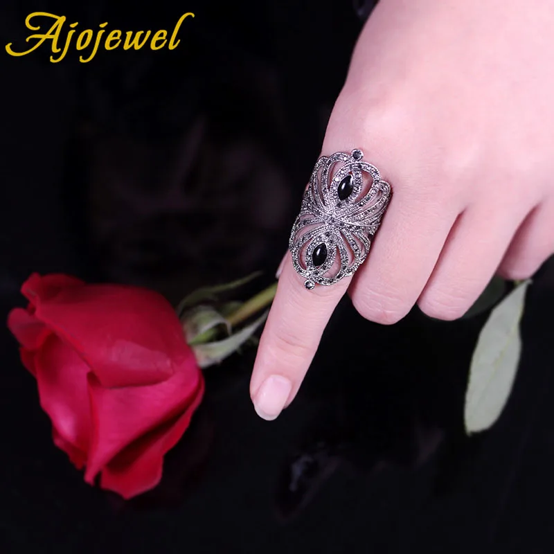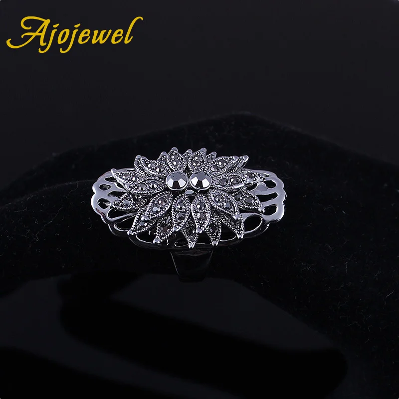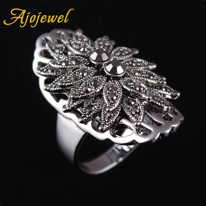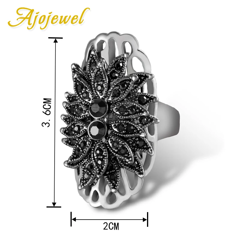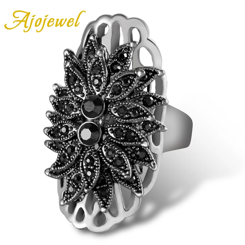 Женские большие кольца в винтажном стиле, уникальные черные стразы с кристаллами и цветами