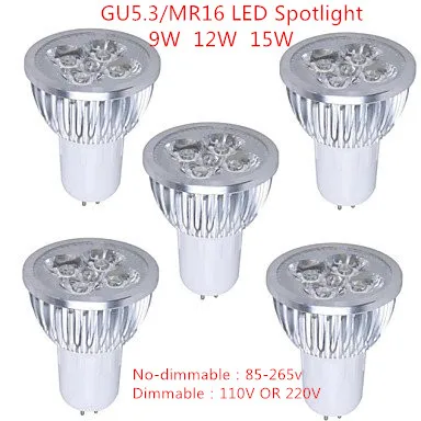 Супер яркий светодиодПрожекторы с регулируемой яркостью GU5.3/MR16 9W 12W 15W