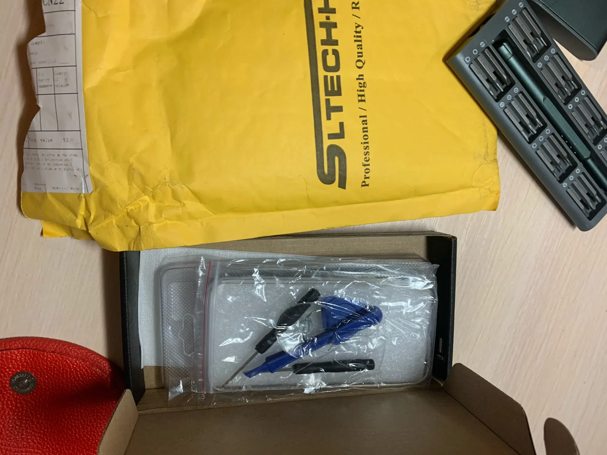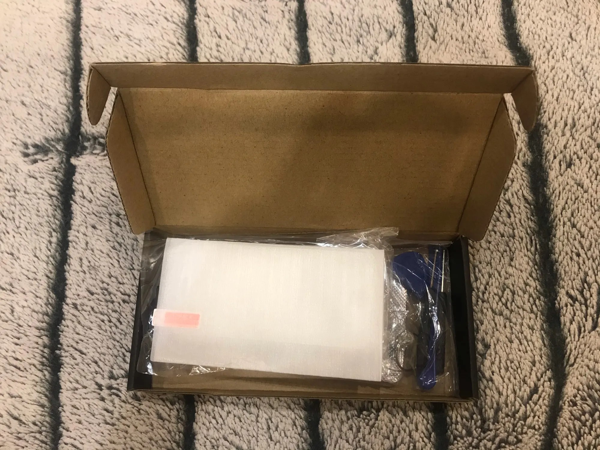 Пришло за две недели! Раньше заказывал у продавца и все было хорошо. Сейчас приехал дисплей и такое чувство, будто его таскали по полу (на фото видно), но сам дисплей в плёнке и целый на первый взгляд. В комплекте инструмент, силиконовый чехол и защитное стекло.