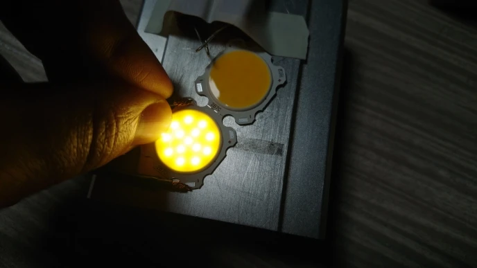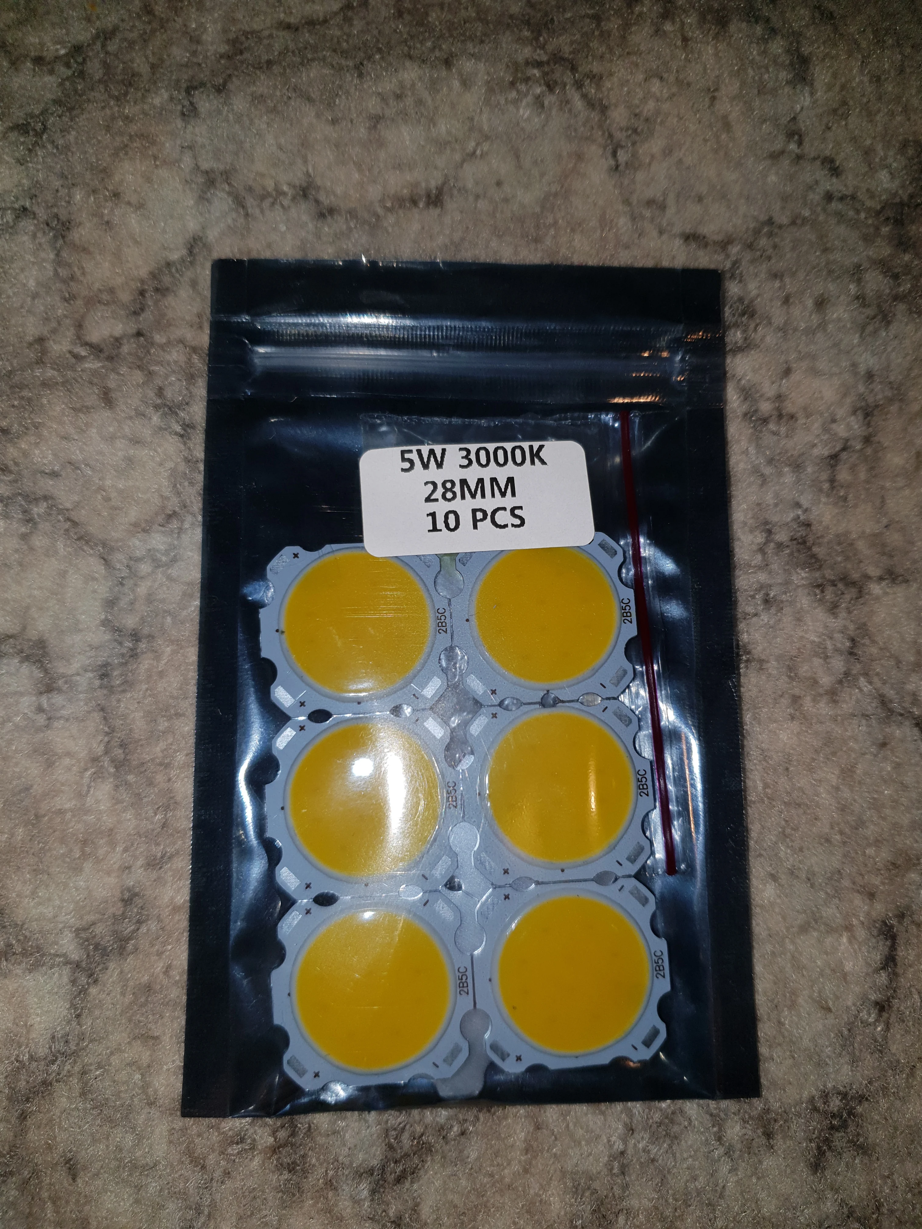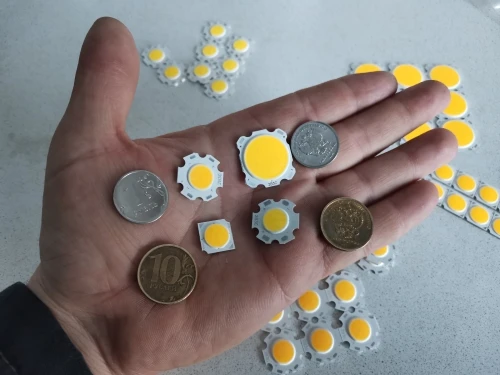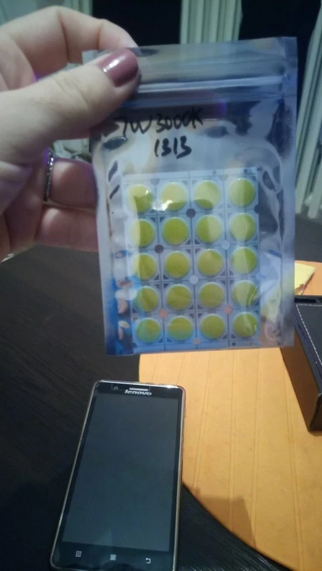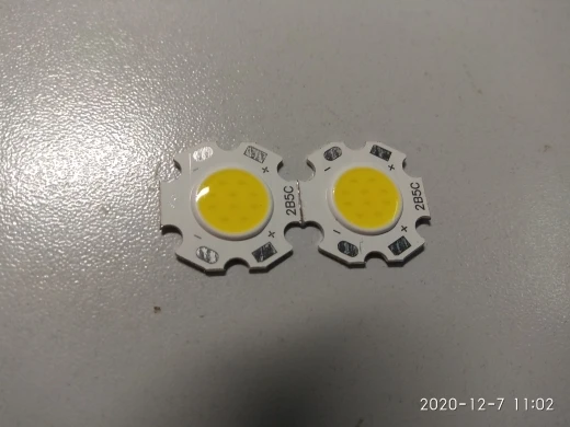 Пришли за две недели с треком. Купил ради интереса 12V 2B3C двух видов с люминофором диаметром 11мм и 20мм. Матрицы (оба вида) нормальные, кристаллы зажигаются на мин. токе равномерно, на 250мА разброс напряжения: у ф11мм= 9,25V-9,85V, у ф20мм=9,65-9,75V. Отобрал по 1шт с близкими параметрами, закрепил (с термопастой) на общий радиатор и сравнил яркость в самодельном лайтбоксе с помощью люксметра и яркость оказалась одинаковая :), дал прогреться пол часа (большой быстрее греет радиатор) и тут разница проявилась - ф11мм стали тусклее, но всего на 1,5-2%. Сравнил (вне конкурса:) с хорошими светодиодами 5630 (3000k) купленными у Люськи (кто в теме тот знает) распаянные на на алюмин. подложку 2B3C (ток 0,25А U=8,72V) они оказались ярче более чем в 1,5 раза, но цена такой "матрицы" почти пол доллара, а эти COB'ы за 10шт меньше 1$.