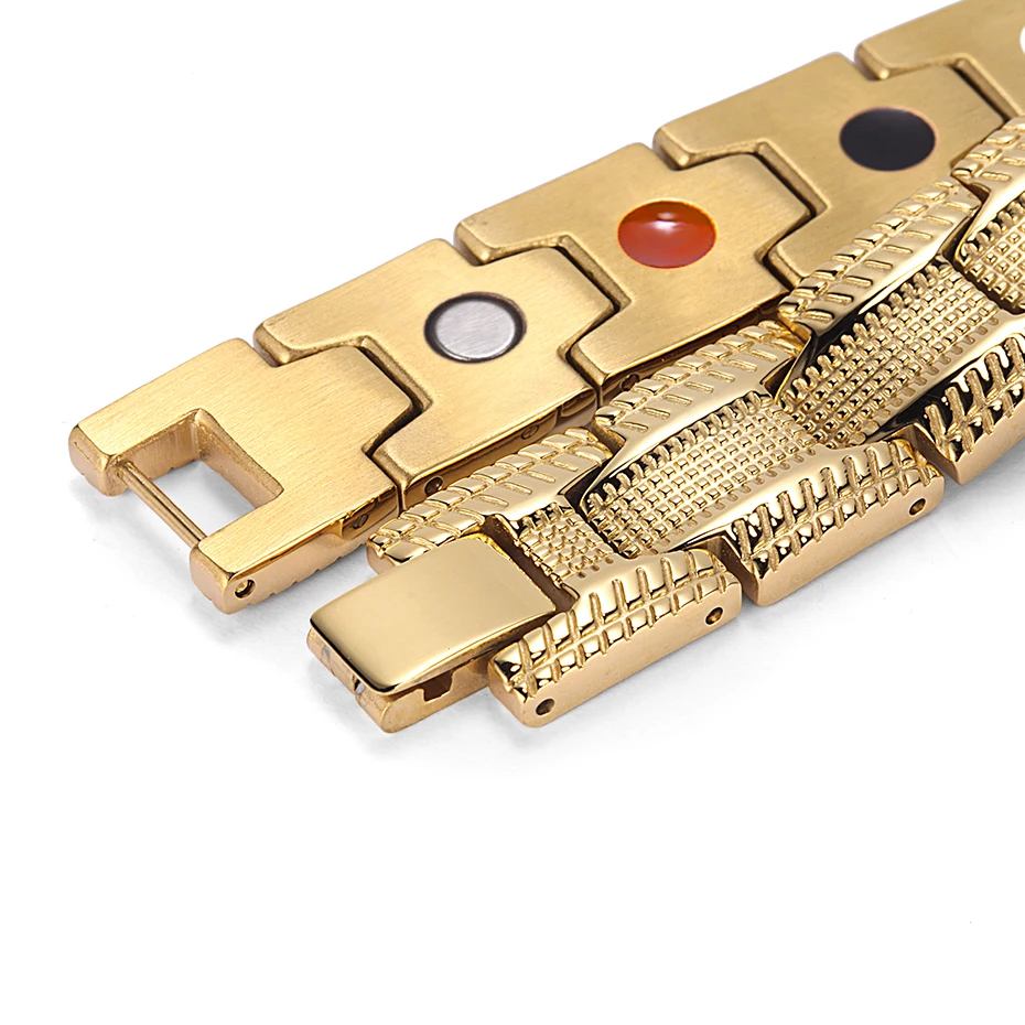Материал Нержавеющая сталь 316L с магнитами, отрицательными ионами, пихтой и германием Размеры/Длина 21,5 см/шт. (6,5-8,5 "/pc) Вес Около 50 г/шт. Ширина 10-12 мм(0,47 ") Штраф или Мода Модный браслет из нержавеющей стали 316l Китай Цвет Золото Рынок ЕС, США, Австралия и так далее Пол Мужчина, женщина, унисекс, влюбленные Упаковка Электростатическая пленка/opp bag Акция Каждый год несколько стилей по цене 30-50%