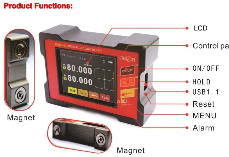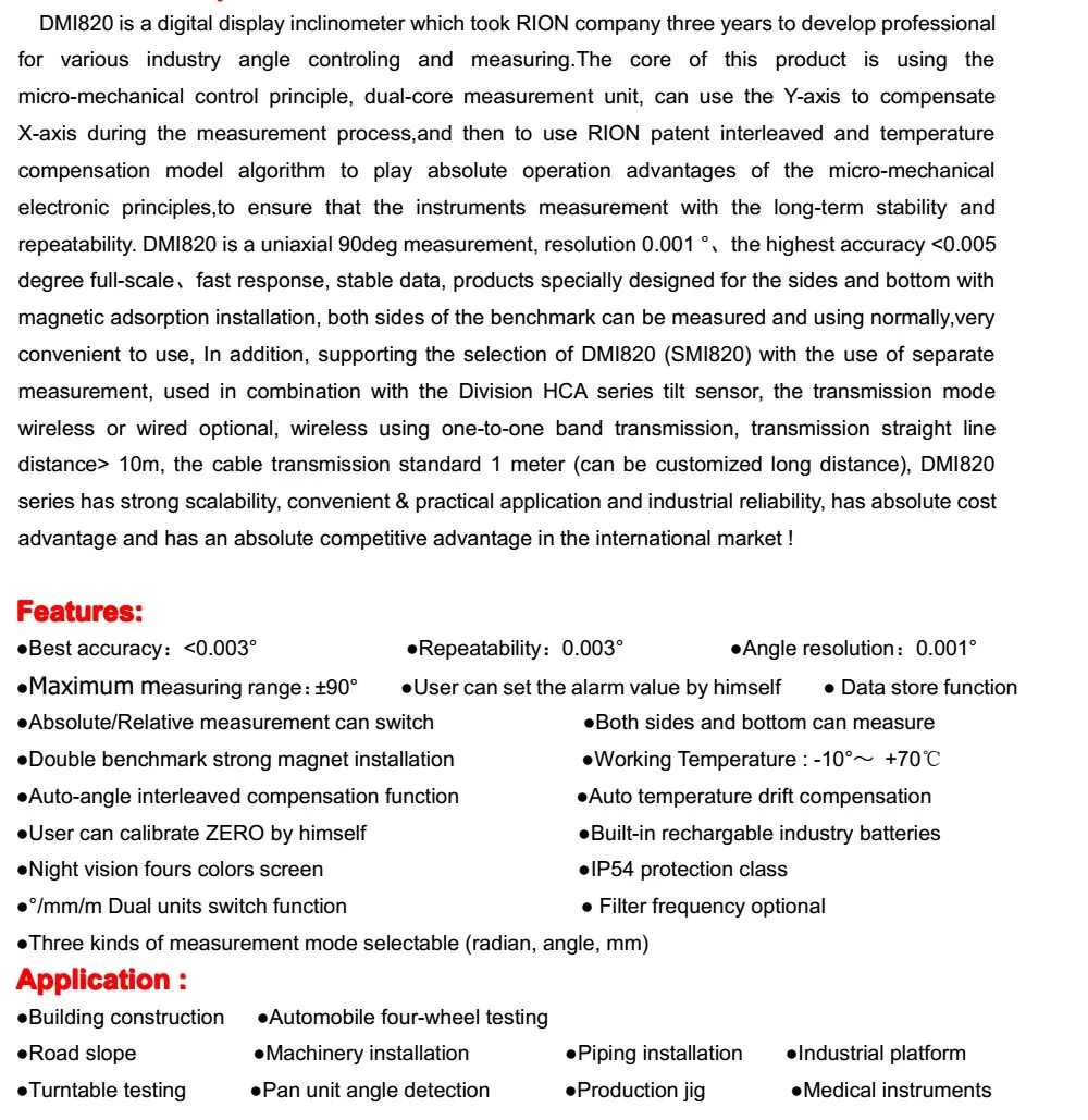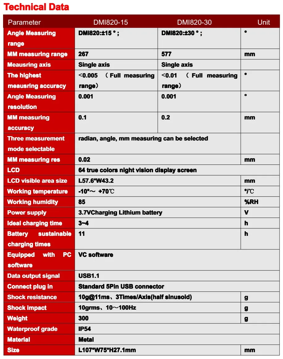 DMI820-15Стандартный Двухосевой цифровой дисплей Инклинометр ± 15 °DMI820-30Стандартный Двухосевой цифровой дисплей Инклинометр ± 30 °