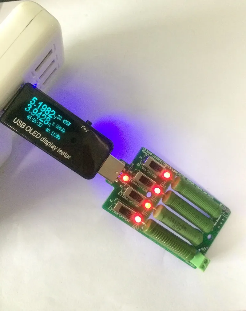 Спроектирован по принципу Ом и через резистор параллельно через другой переключатель, может произвести 15 видов Сопротивления нового USB электронного сопротивления нагрузки разряда, когда весь переключатель открывается, составляет 2,2 Ом/10 Вт, 4,7 Ом/10 Вт, 10 Ом/10 Вт, 20 Ом/10 Вт 4 вида сопротивления параллельно в то же время, в напряжении 5 в почти может произвести ток разряда 4А.