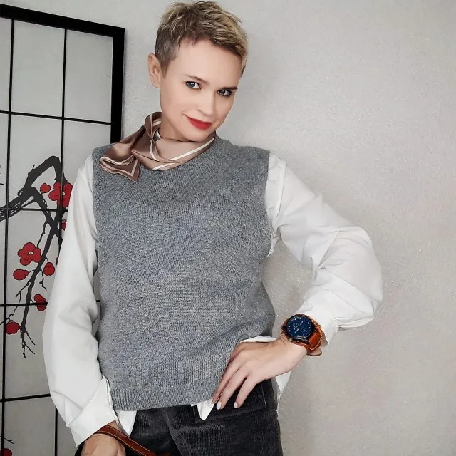 Качество очень хорошее, чувствуется шерсть в составе. Греть особо не будет, тонкая. Но на рубашку в офис - очень стильно будет. Брала на российский 46-48, грудь 95, сидит свободно. Доставка в Спб 3 недели. Товаром довольна. Спасибо!
