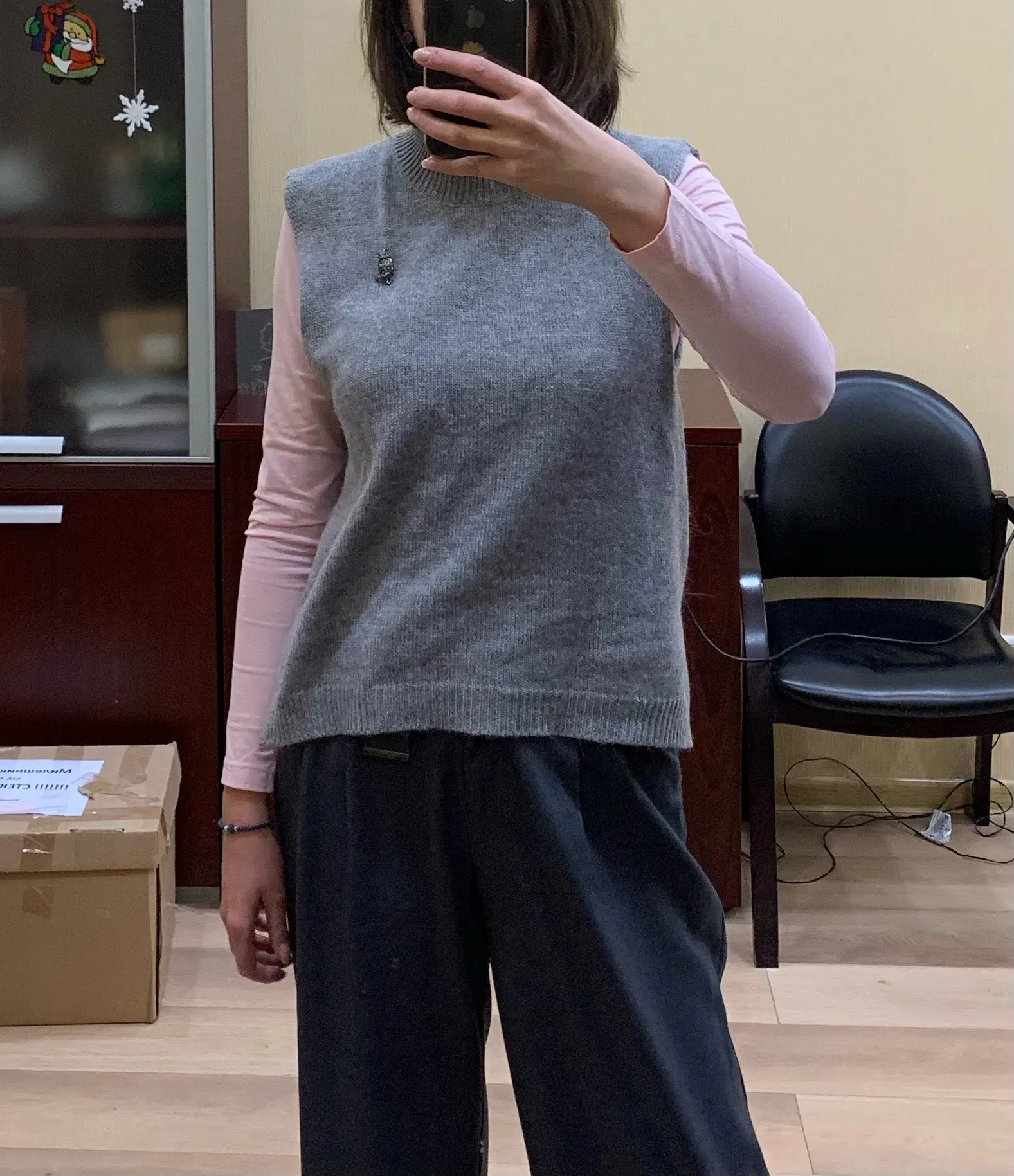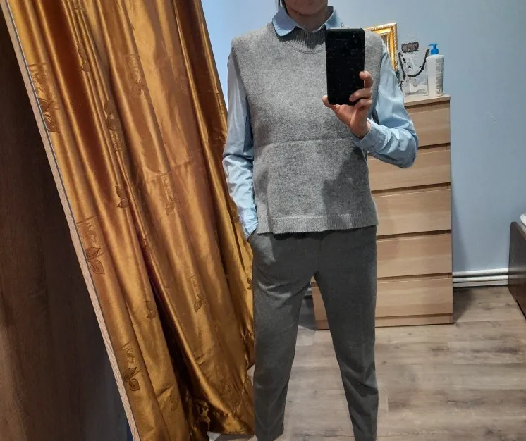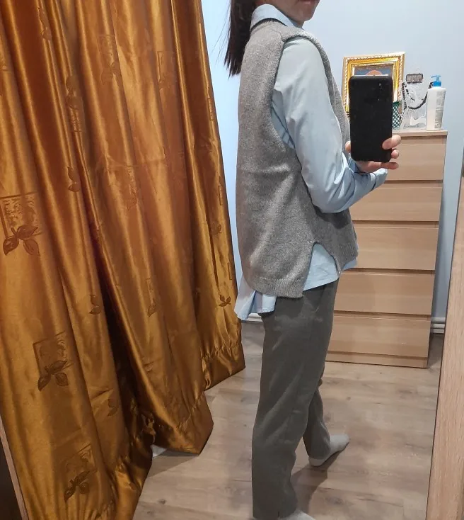 Качество жилета хорошее, соответствует описанию. На свой размер XS покупала L-ку, сидит не оверсайз, но и не в обтяжку. Но как-то смотрится жилет не очень ("куцо"). Если взять размер больше, будет уже очень широко, но также коротко