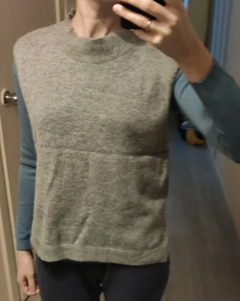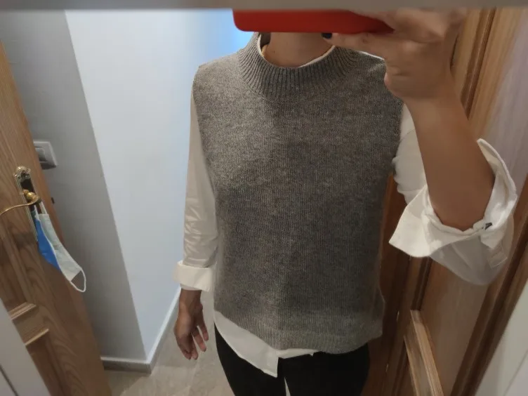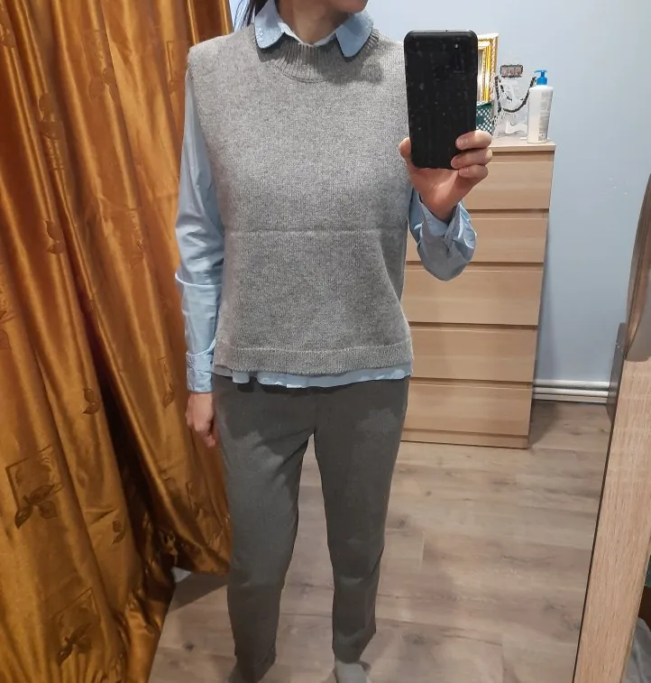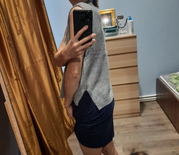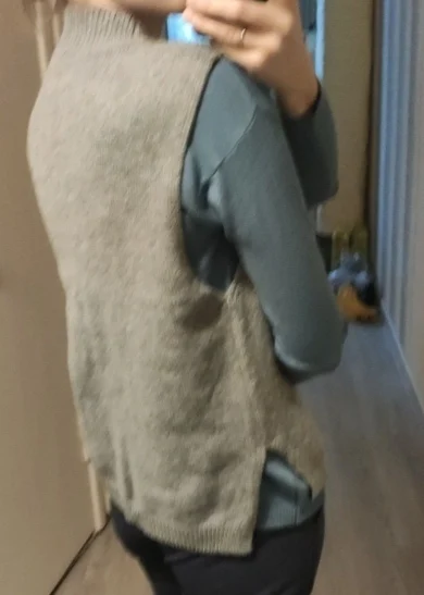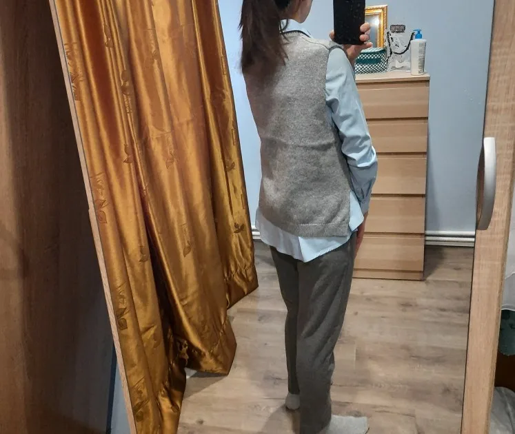 Отличная жилетка, теплая, чувствуется шерсть в составе. Немного грубоватая вязка, но мне нравится. На размер XS взяла XL - подошла отлично, свободно, но не чересчур, подмышки не топорщатся (переживала немного, т.к. грудь 80). Коротковата, но не криминально, я была к этому готова по прошлым отзывам. В целом - прекрасная жилетка за свою стоимость