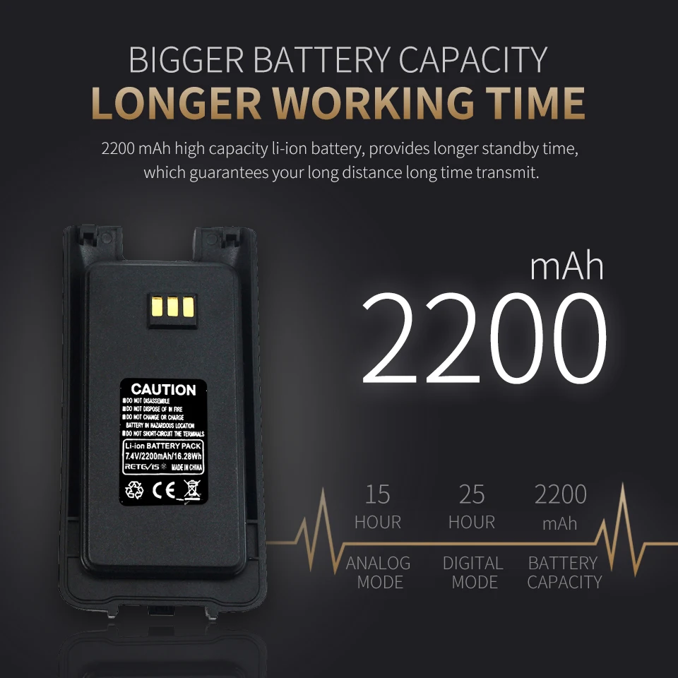 Долгое время ожидания, длительное время использования. аккумулятор большой емкости гарантированно работают в течение длительного времени, а цифровая технология TDMA может продлить срок службы аккумулятора и увеличить время использования на 40% по сравнению с аналоговыми рациями, что позволяет RT81 выигрывать больше времени.