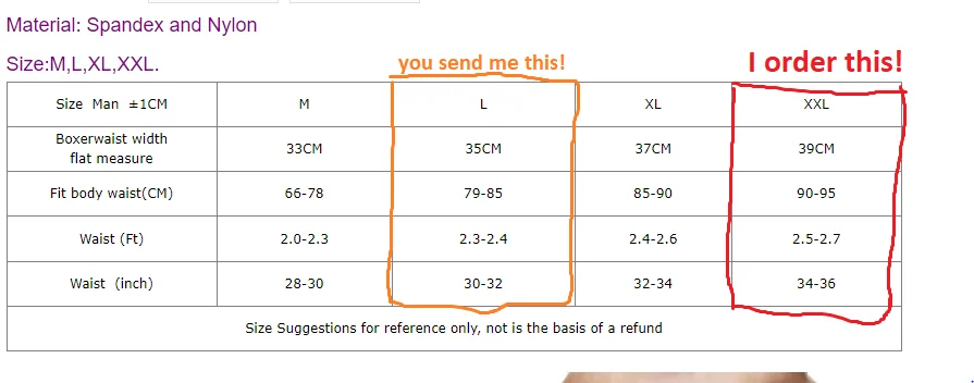 C'est une honte j'ai commander le maillot de bain dans la taille XXL qui correspond a une dimension tour de taille 90-95 cm et boxer mesurer a plat de 39 cm et je reçois une taille L pour un tour de taille de 79-85 cm et boxer mesurer a plat de 35 cm! J'ai alors contacter le vendeur qui me répond que les tailles indiquer ne sont pas correct car ancienne collection et que c'est que des petite taille! C'est honteux d'escroquer les gens de cette manière! J'ai demander le remboursement !