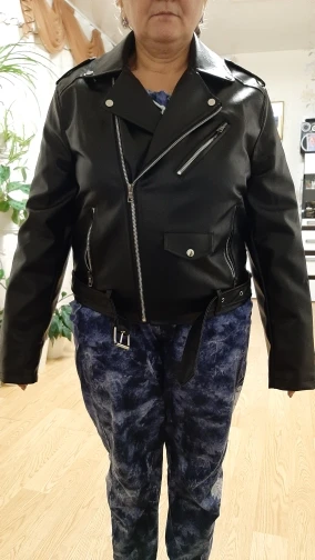 Рост 157 см, плечи 37, ог87от69об94, размер М подошёл, на футболку и тонкую трикотажную кофточку надеваю спокойно, на толстый свитер навряд ли налезет, не застегнется скорее всего. Запах ужасный просто. Кожзам плотный, матовый, фурнитура серебристого цвета