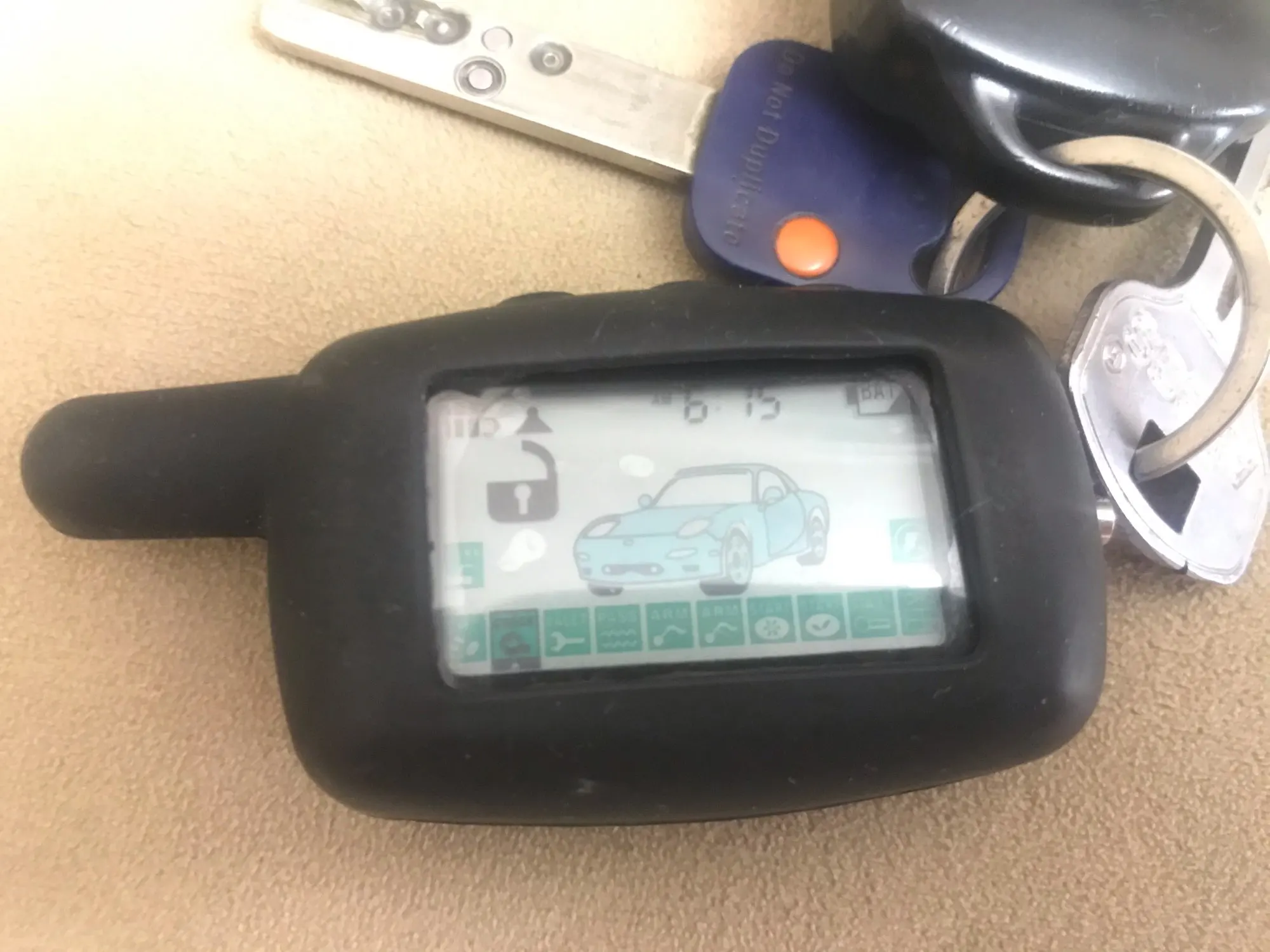 Все пришло целое, чехол попросил черный его и положили, упаковано достаточно хорошо, сам брелок замотан в пупырку. Первый запуск прошел нормально, звуки издает корректные, на экране все как и положено. Привязку не проверял.