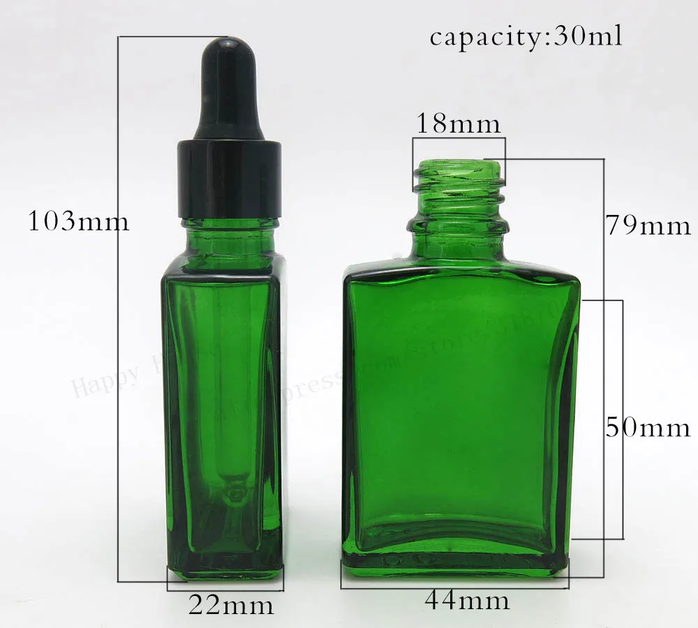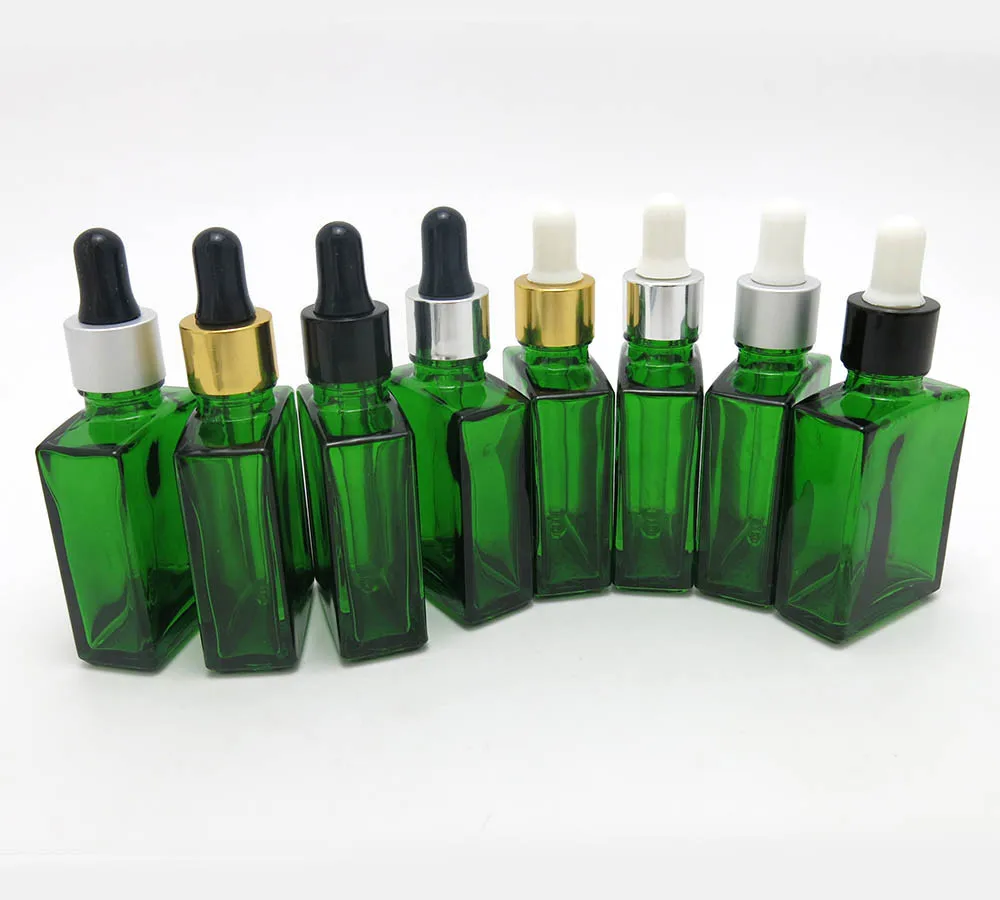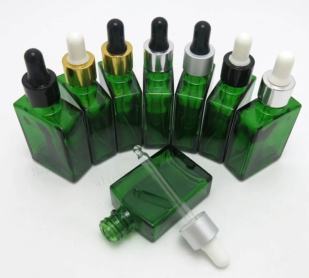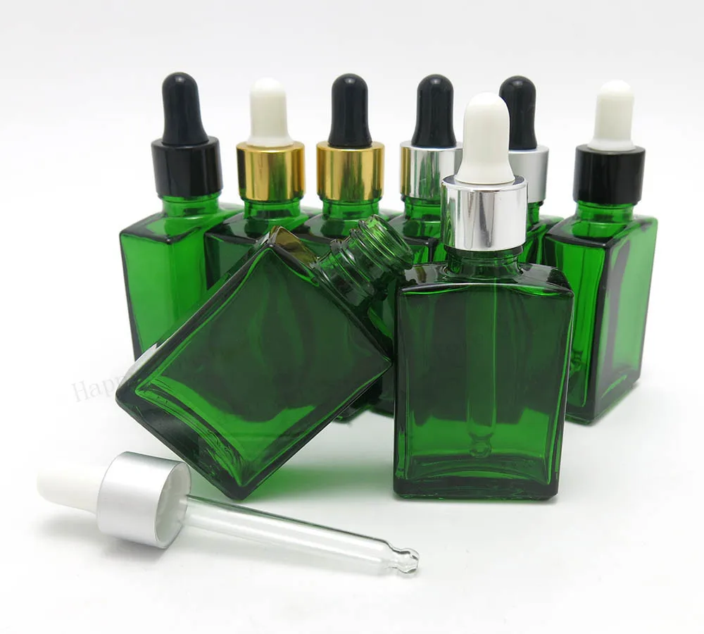 12 шт.лот 30 мл Кобальт зеленый плоские квадратные стеклянные бутылки с алюминиевыми флакон-капельница 1oz пустой стеклянный флакон-капельница контейнер