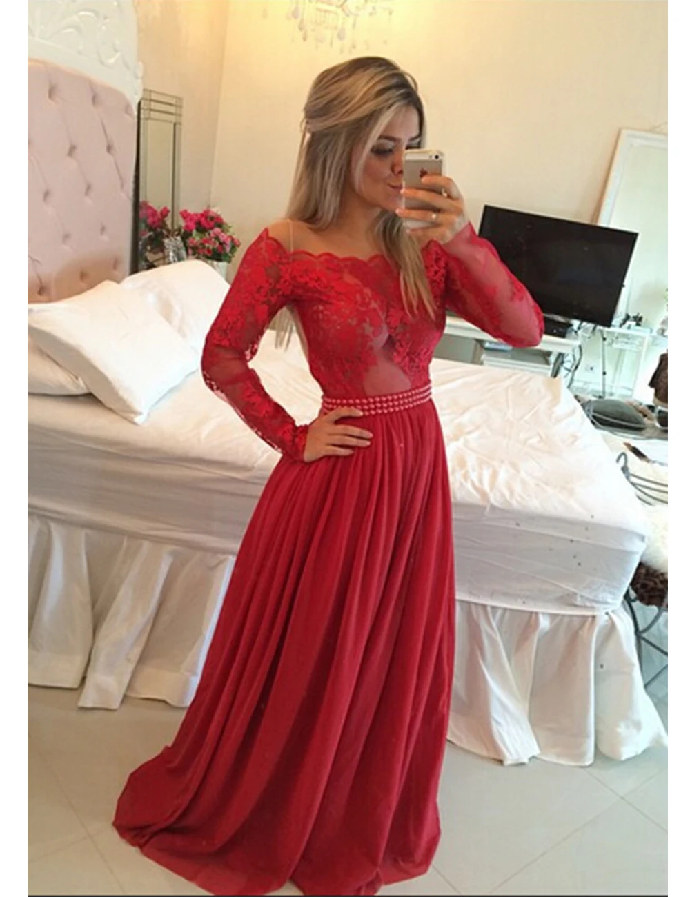 Элегантное кружевное платье с длинным рукавом для выпускного вечера, красное платье-трапеция в пол с вырезом лодочкой, распродажа 2019