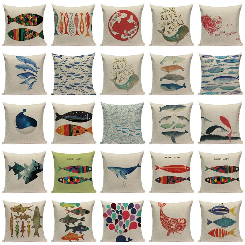 Высококачественная цветная льняная наволочка для подушки с изображением морских животных и рыб, наволочка для подушки на стул, наволочка для подушки на заказ 45*45