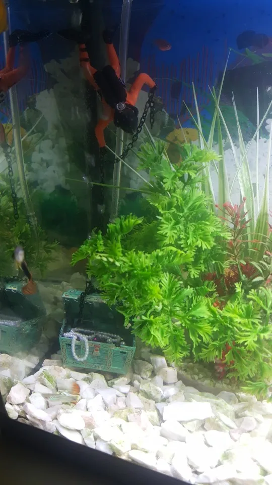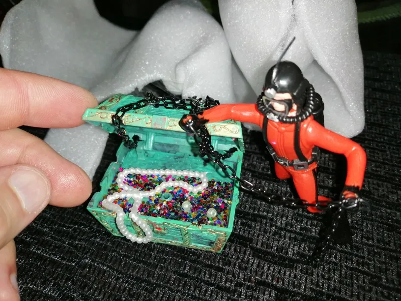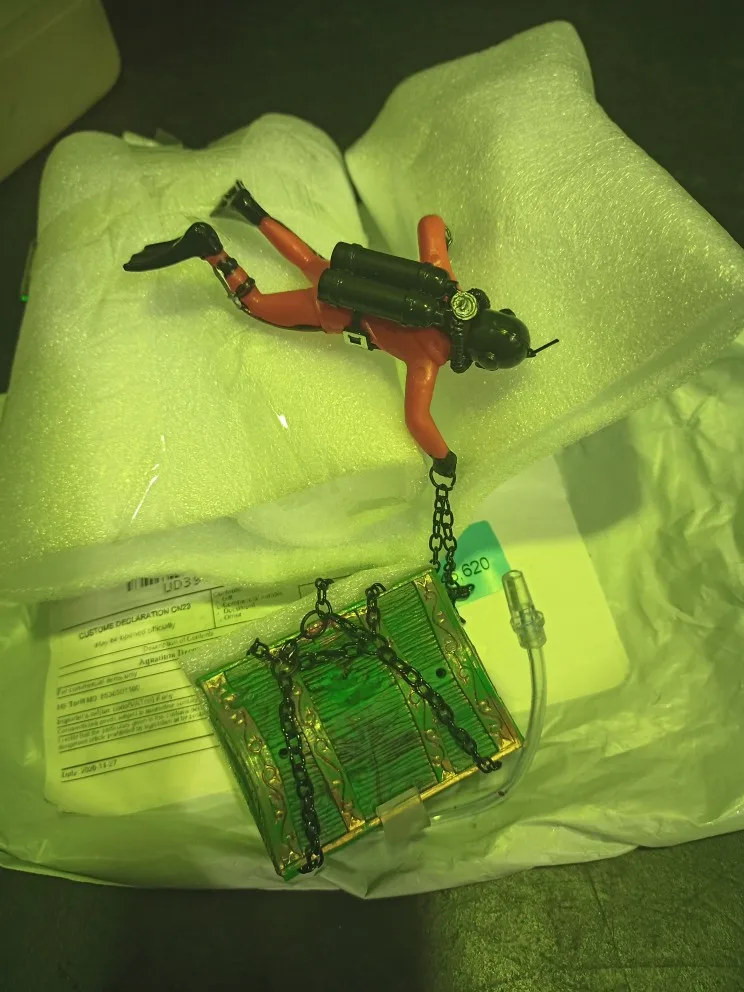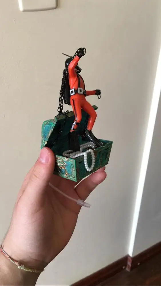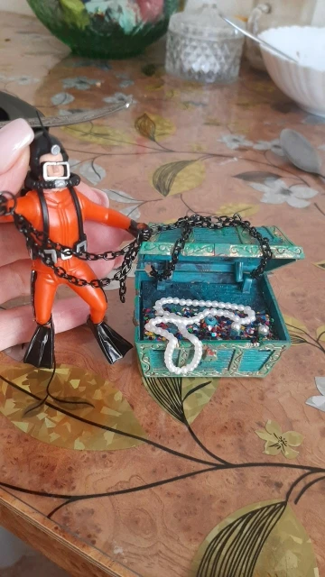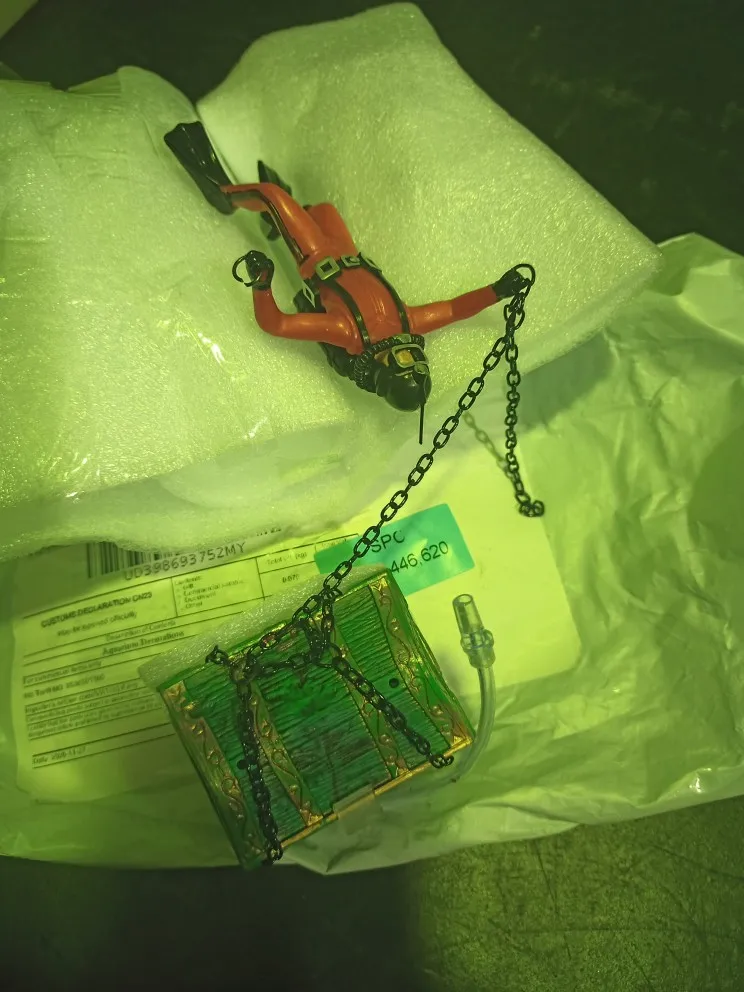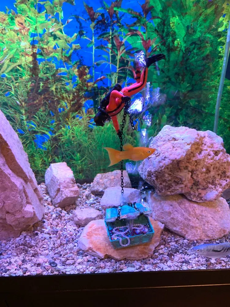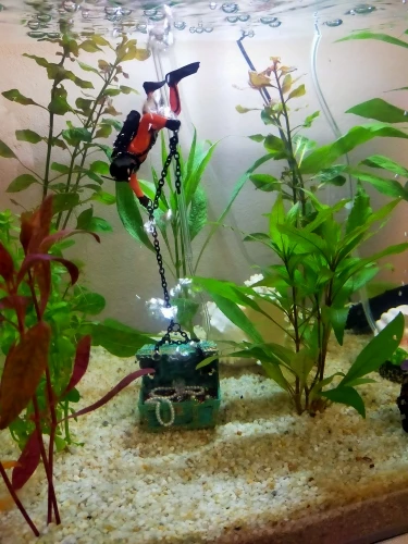 Водолаз-мечта детства! Супер.Легко подсоединяется к аэратору,пузырьки идут.Блестки в сундуке и жемчуг приклеен хорошо.Ребенок стал играть как получили,как наигрался,сполоснула и прикрепила.Все работает.Дошел со всеми моими заказами декорациями для аквариума и от других продавцов в 1 посылке.Спасибо.Получила на почте.Купила за 4.82. Пересыл где-то 2-2.5 месяца...Рекомендую.