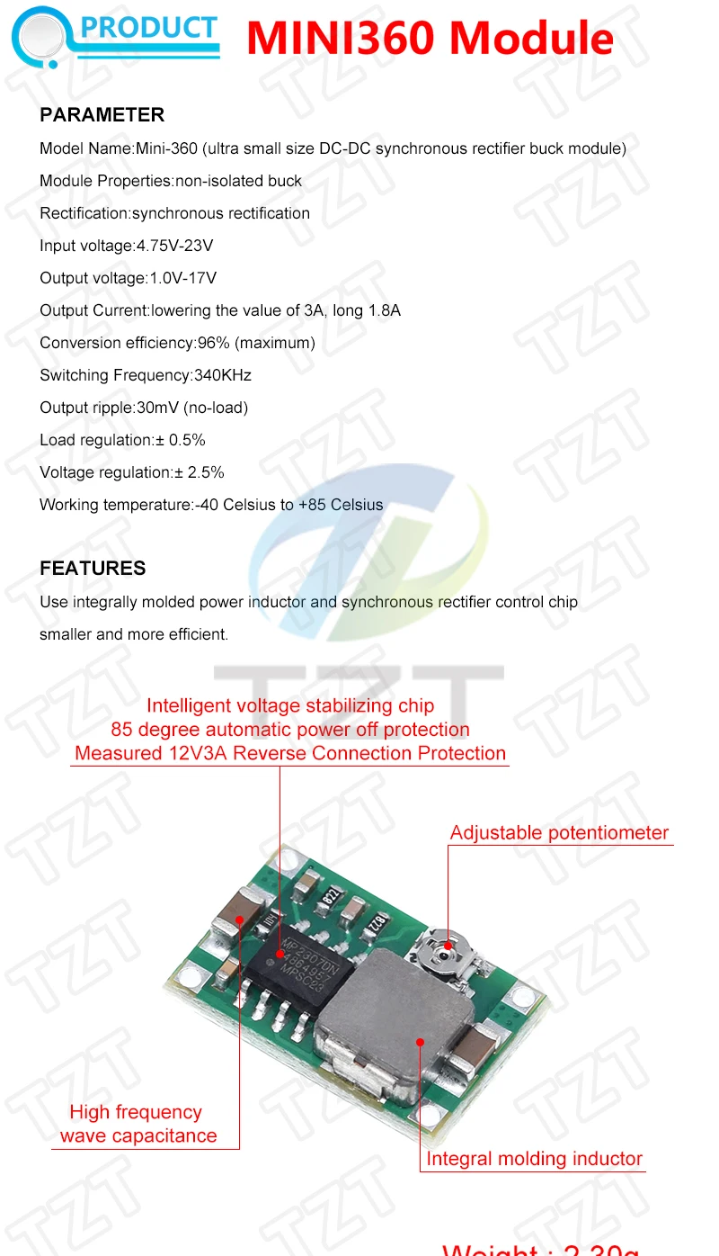Понижающий преобразователь TZT Mini360 DC-DC, понижающий модуль 4,75 в-23 в 1 В-17 в 17x11x3,8 мм SG125-SZ +