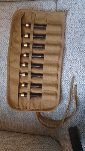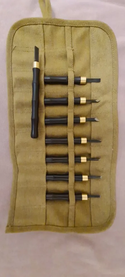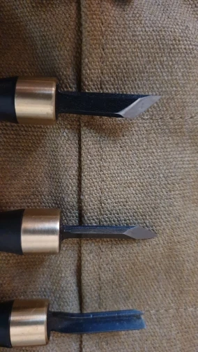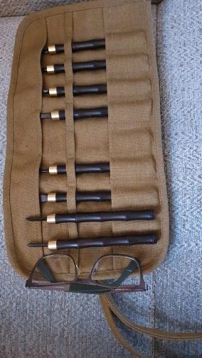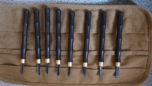 Received Quickly to the UK, Product Matches Description, Looks Pretty Good, Blades are Sharp, Some surface rust is present on 3 of the blades, but nothing really to worry about, The set is quite small comparing to western wood turning tools, for delicate wood carving I would say, as a comparison in size see photos and my spare glasses as reference, not sure what the handles are made of, don't think its Bamboo, seems pretty solid. I have not tried them yet so cannot give the results yet, they come well packed in a cardboard box in a Japanease Army Colour Khaki Canvas Roll up Pouch. Will give a update when I get chance to use them.