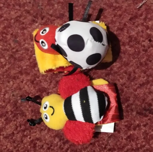 прикольные игрушки, ушки шуршат, в носу колокольчик, приятный звук, но сомневаюсь что дам грызть это ребенку так как все равно это синтетика.