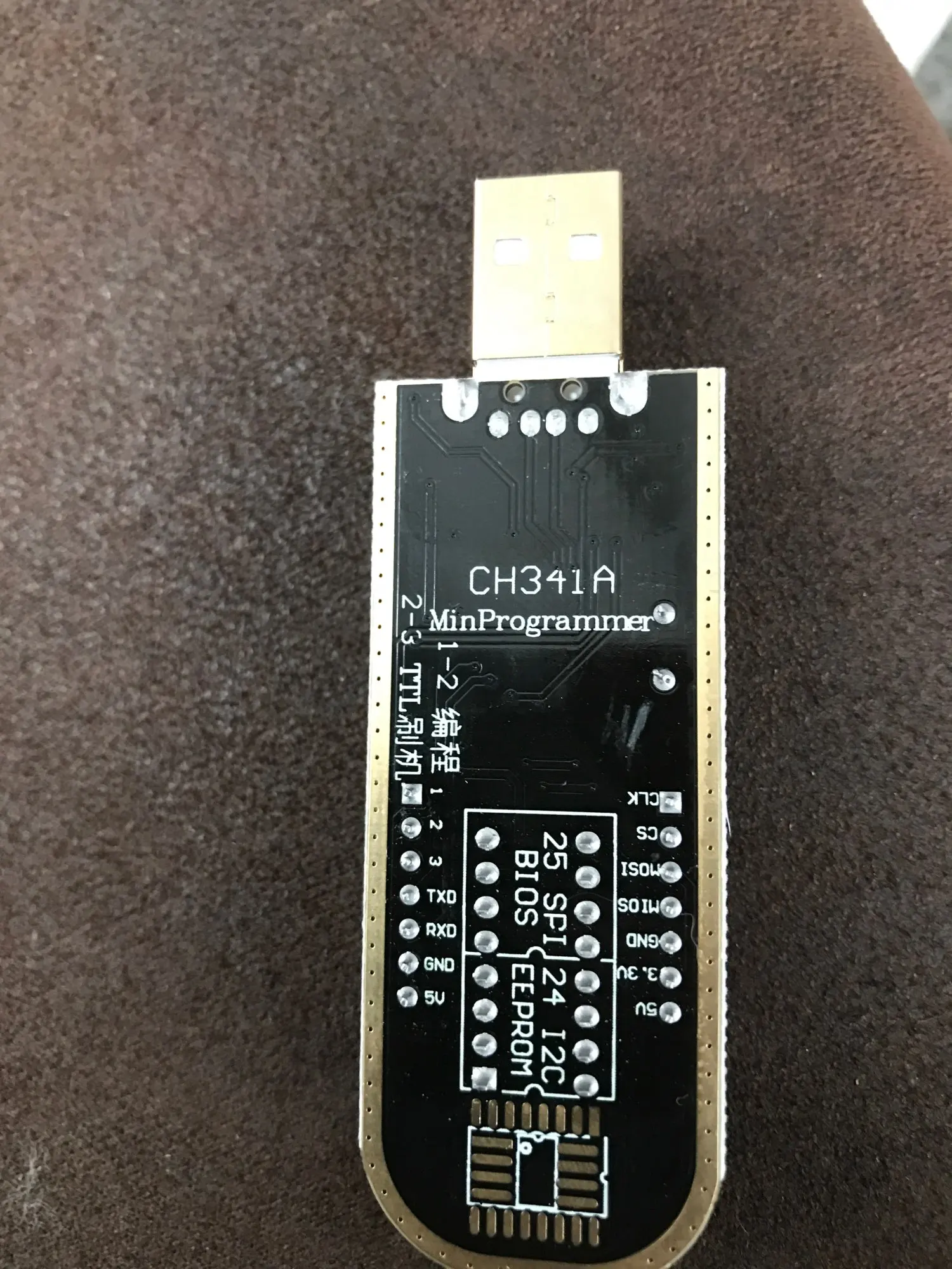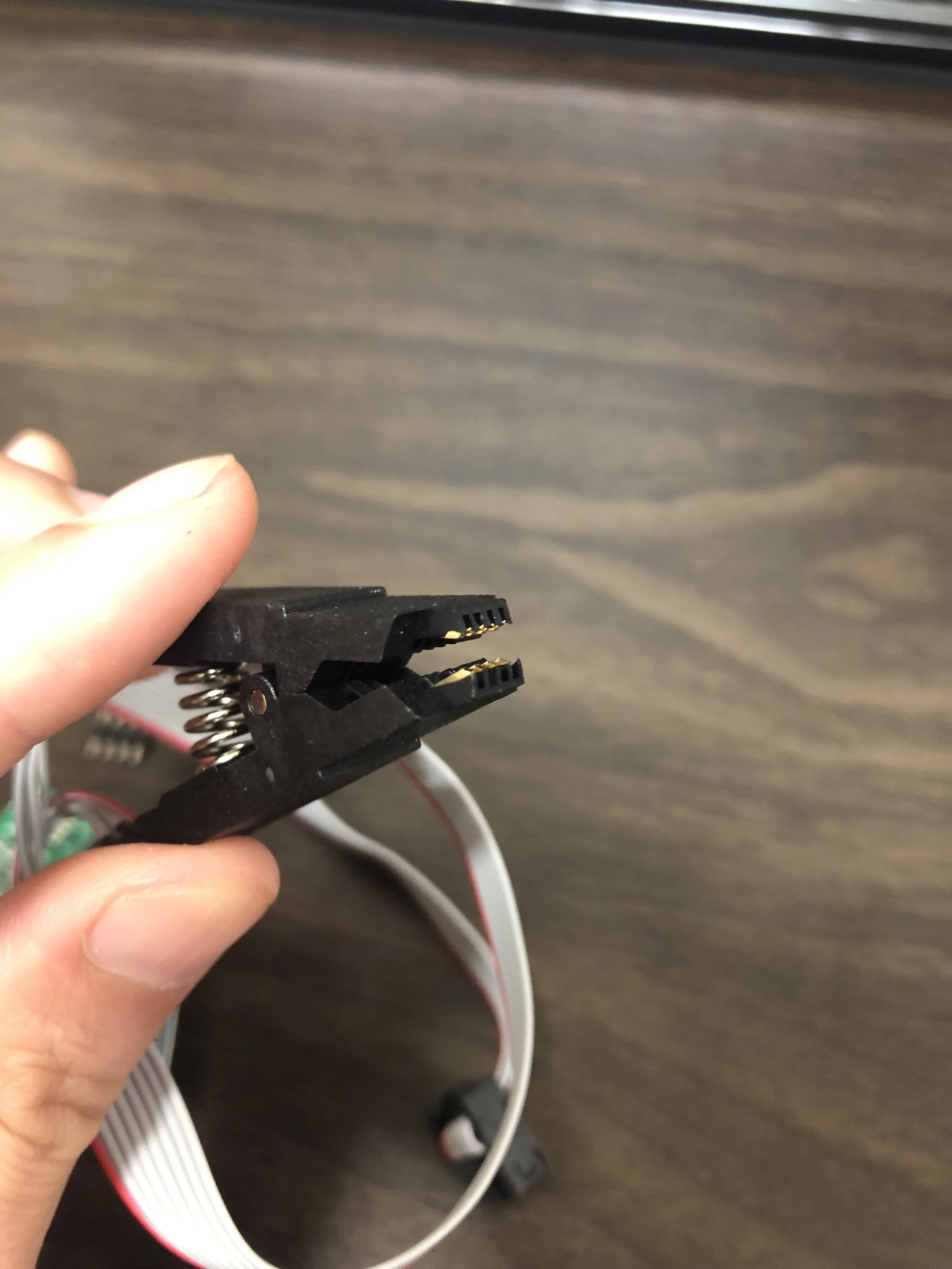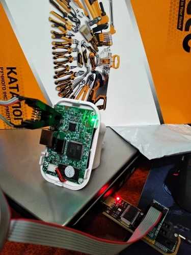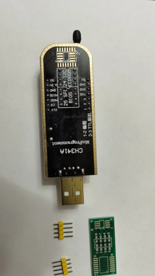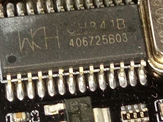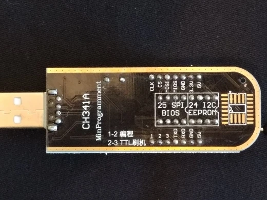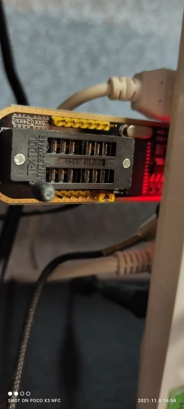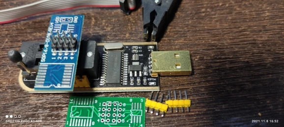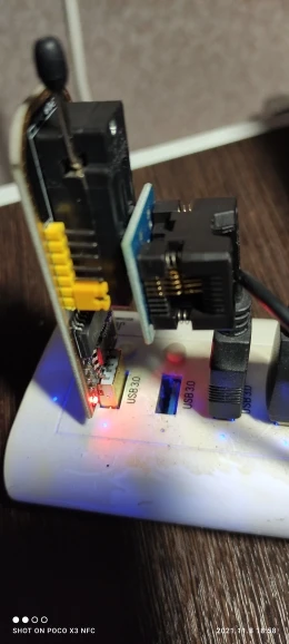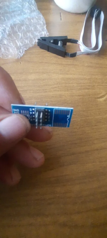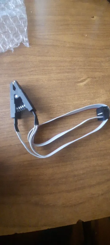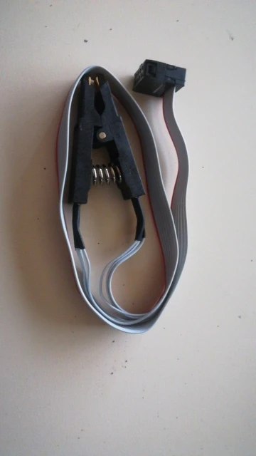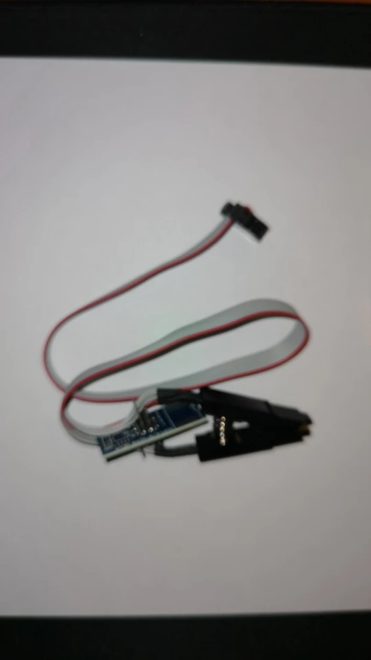 Сварные швы плохо закончены, но это работает. Обратите внимание на соединение, которое немного сложнее. Вы должны помочь с рисунками на модуле ch341и, прежде всего, соблюдать порядок застежек. Застежка 1 соответствует красной нити на зажиме, а точка выгравирована на чипе. Сначала Подключите зажим, затем зажим на чипе, чтобы избежать ошибок и бега цепи