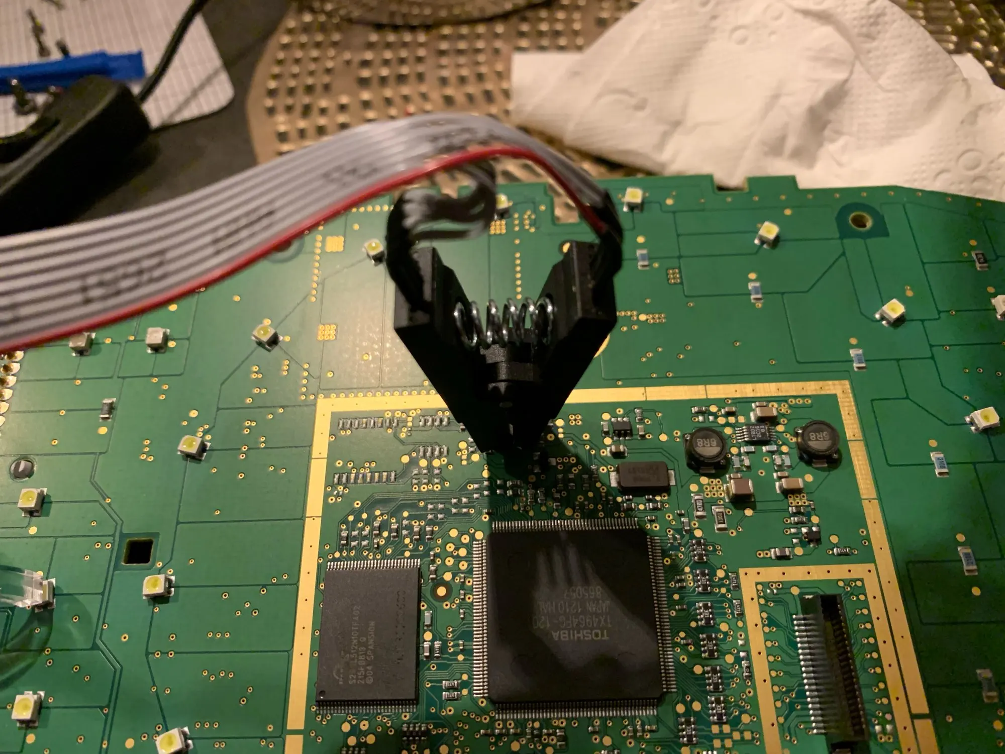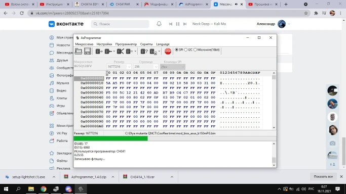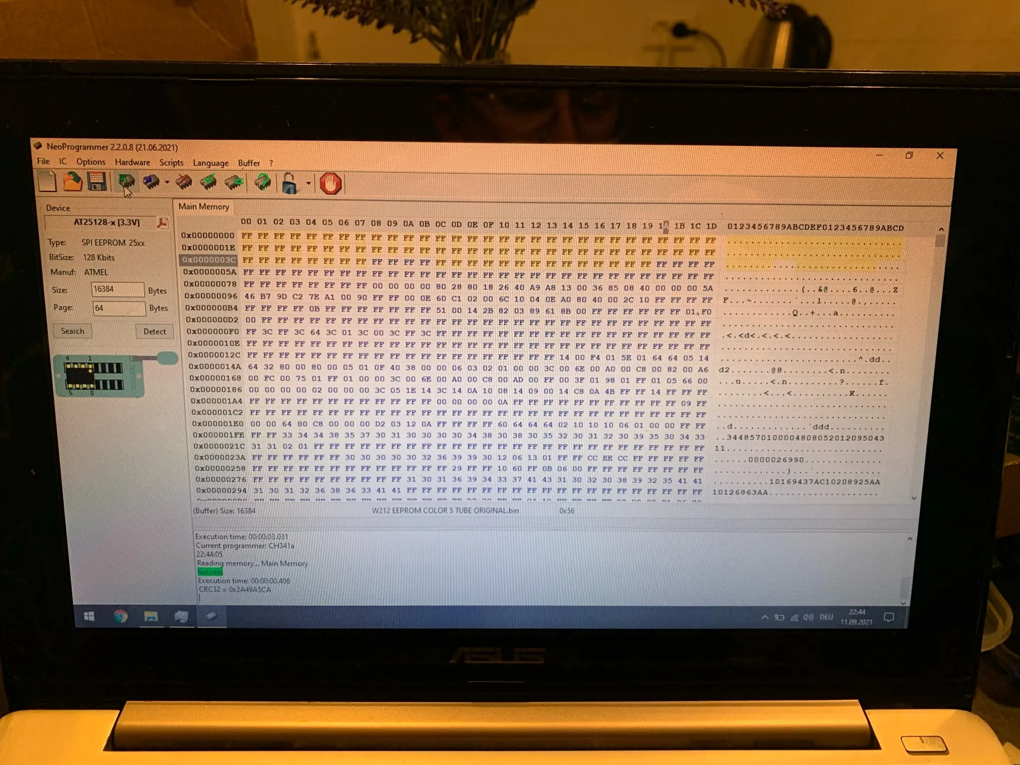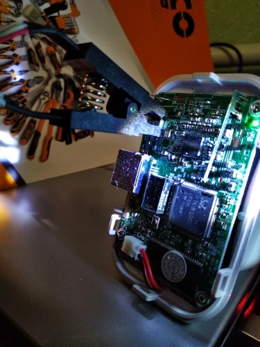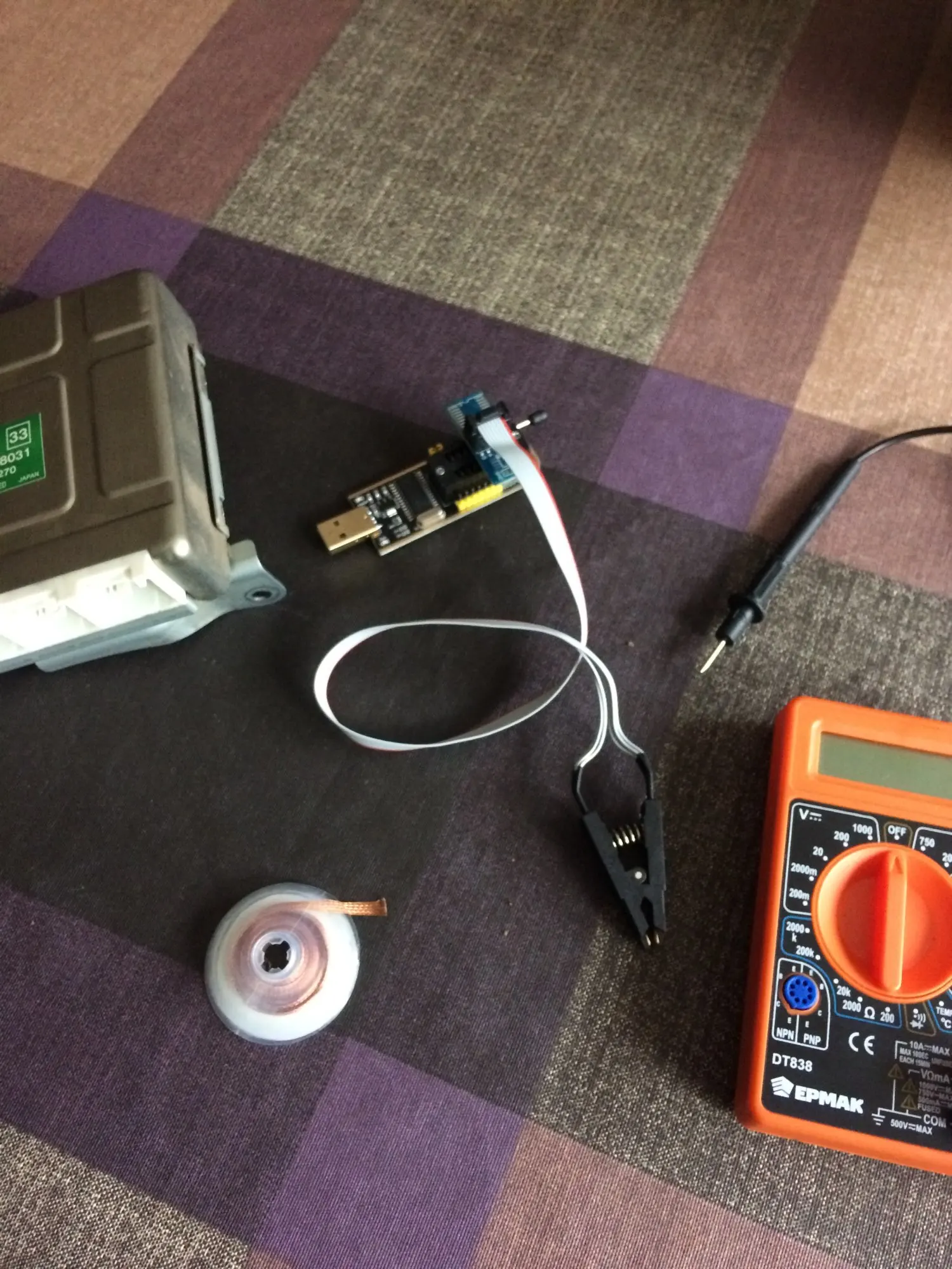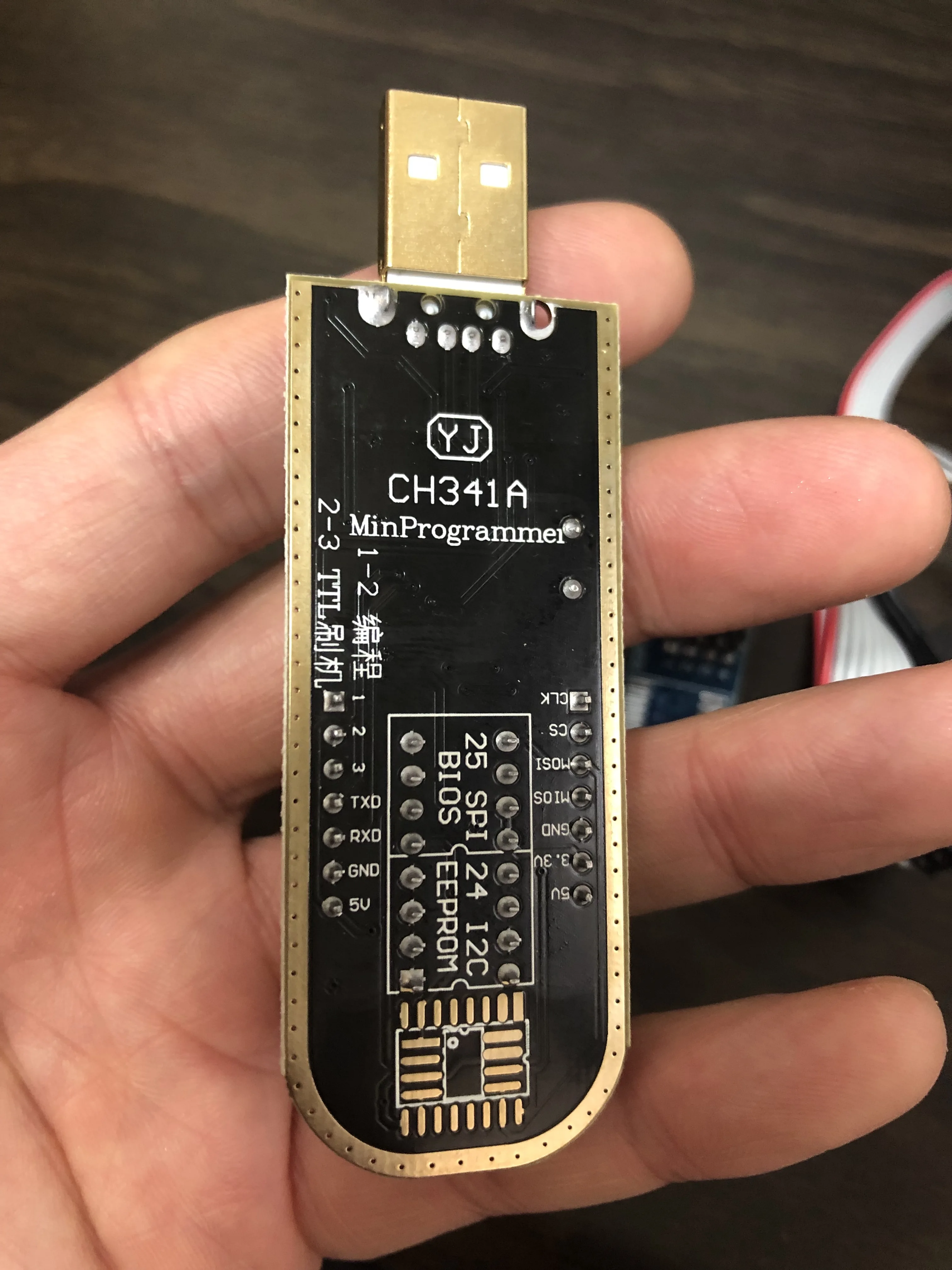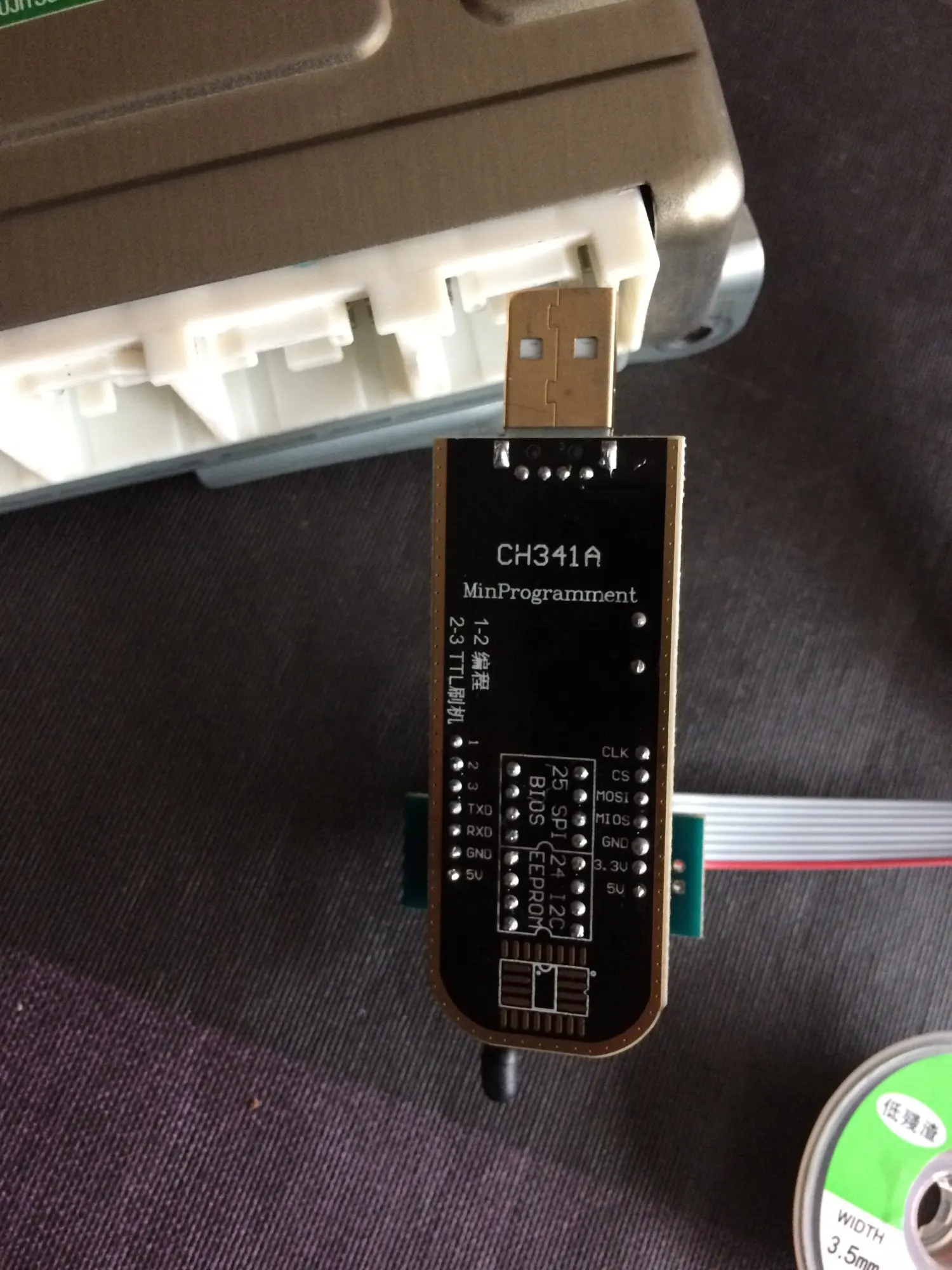 Сварные швы плохо закончены, но это работает. Обратите внимание на соединение, которое немного сложнее. Вы должны помочь с рисунками на модуле ch341и, прежде всего, соблюдать порядок застежек. Застежка 1 соответствует красной нити на зажиме, а точка выгравирована на чипе. Сначала Подключите зажим, затем зажим на чипе, чтобы избежать ошибок и бега цепи