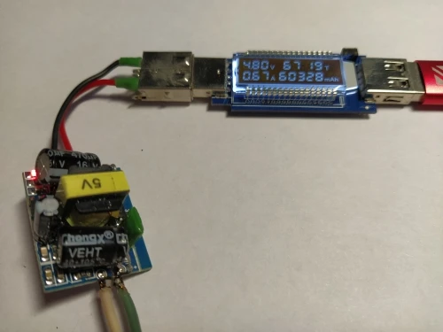 Напряжение под нагрузкой стабильно 4.8V Ток скачет от 0.6A до 0.8A Невнятно обозначено, куда 220V подключать, но разобраться нетрудно: две контактные площадки на краю платы, где ничего не распаяно (с двух сторон от пропила) Упаковка совсем плохая, только пакеты. Немного "помятые" приехали, но все работают.