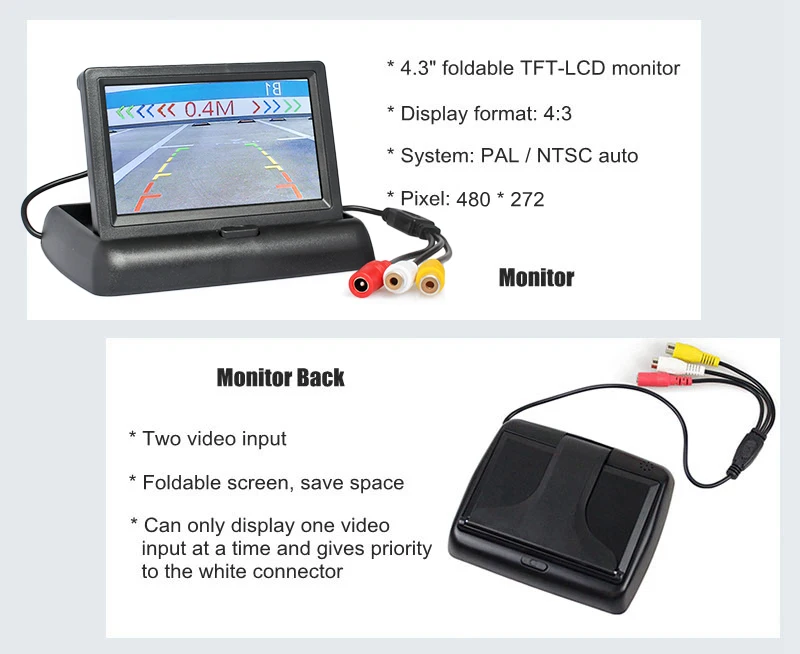 Монитор: цифровой TFT LCD Размер дисплея: 4,3 дюйма Формат отображения: 4:3 Мощность: 3 Вт Источник питания: 12 В постоянного тока Видео: 2AV вход, автоматический переключатель заднего хода Система: автоматический переключатель PAL / NTSC Контраст: 350:1 Пиксель: 480*272
