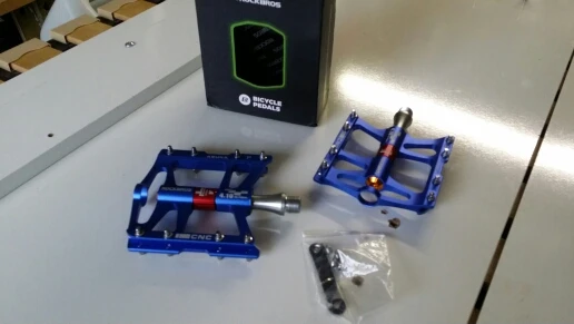 Заказывал черные педали. Продавец больше недели не отправлял, и после пинка предложил заменить на красные. Т к красные мне ни. к чему не подходили я согласился ещё подождать и буквально через 2 дня мне были отправлены черные педали. Сами педали отличные. Нет никаких люфтов и болтанки. финишная обработка отличная, в комплекте запасные шипы с ключом. обратите внимание, что педали очень широкие. Поставил на детский велосипед, т к ребенку сложнее позиционировать ногу. Пришлось в самый раз. Рекомендую!