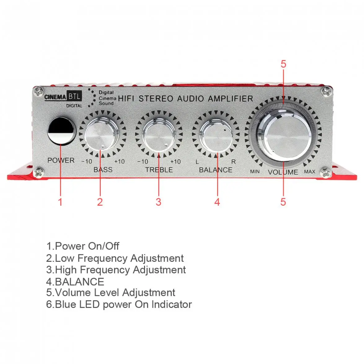 Особенности:-2 канала мини усилитель, 1 Основные каналы и 1 объемный выходной канал.-Светодиодный индикатор цвета радуги.-Этот товар поддерживает Вход mp3, VCD / DVD.-Фильтрация и защита от мощности.-Контроль тона с высокими частотами/басами/балансом и регулятором громкости.-Идеально подходит для вашего автомобиля, мотоцикла, лодки и т. д.-Компактный и эффективный, идеально подходит для обработки ваших аудио требований в стиле.
