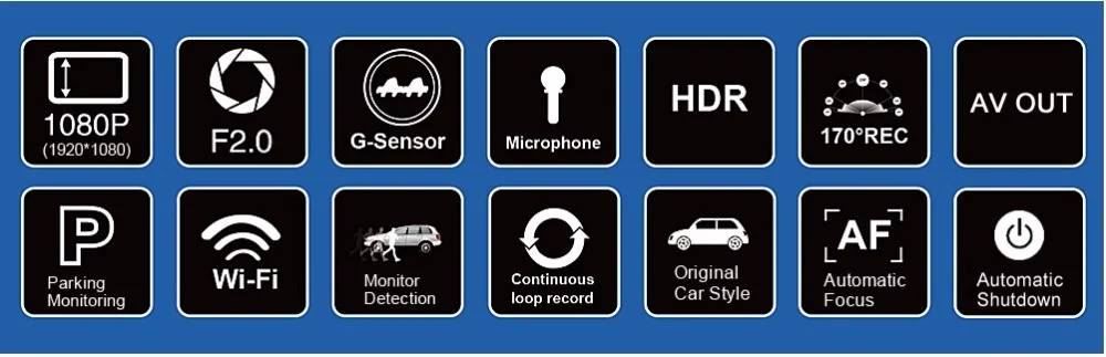 ПриложениеВстроенный WiFi модуль, REALTEK RTL8189ES, вы можете смотреть записанные видео,Загрузите видео, делитесь видео с видеорегистратора на свой смартфон через Wi-Fi.Вы можете скачать приложение Apple Store или другие Android маркеты.Поддержка AV-OUTВидео будет непосредственно на ваш автомобильный монитор, дисплей в режиме реального времени. Он не поддерживает сенсорный экран в вашем автомобильном мониторе.Встроенный g-сенсорСохраните важное видео в специальной папки, чтобы оно не было перезаписано в экстренном случае, вы должны включить g-сенсор с помощью приложения.Видео 1080P, разрешение Full HD, широкий обзорОригинальный сенсор SONY IMX323, поддержка WDR, широкий угол обзора 170 градусов, Большая диафрагма F2.0, 6 слоев стеклянного объектива.24 часа на постоянной основе гвардииКогда ваш автомобиль выключен, он может работать в режиме записи низкой частоты кадров, ему нужно немного энергии от батареи. Сделайте безопасность вашего автомобиля!