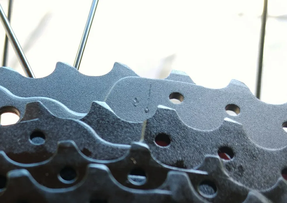 Стальные звезды, 2 алюминиевых паука по 3 звезды. По сравнению с м7000 более равномерное изменение размера звезд, паук и внутренняя часть большой звезды дальше от спиц, что особенно важно на втулках с большим правым фланцем, например novatec d882sb. Кроме того посадочное место немного уже, для посадки на 11 скоростной барабан нужна проставка 1 мм, иначе будет очень большой люфт звёзд.
