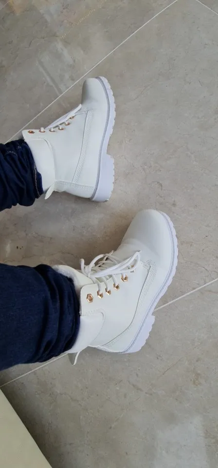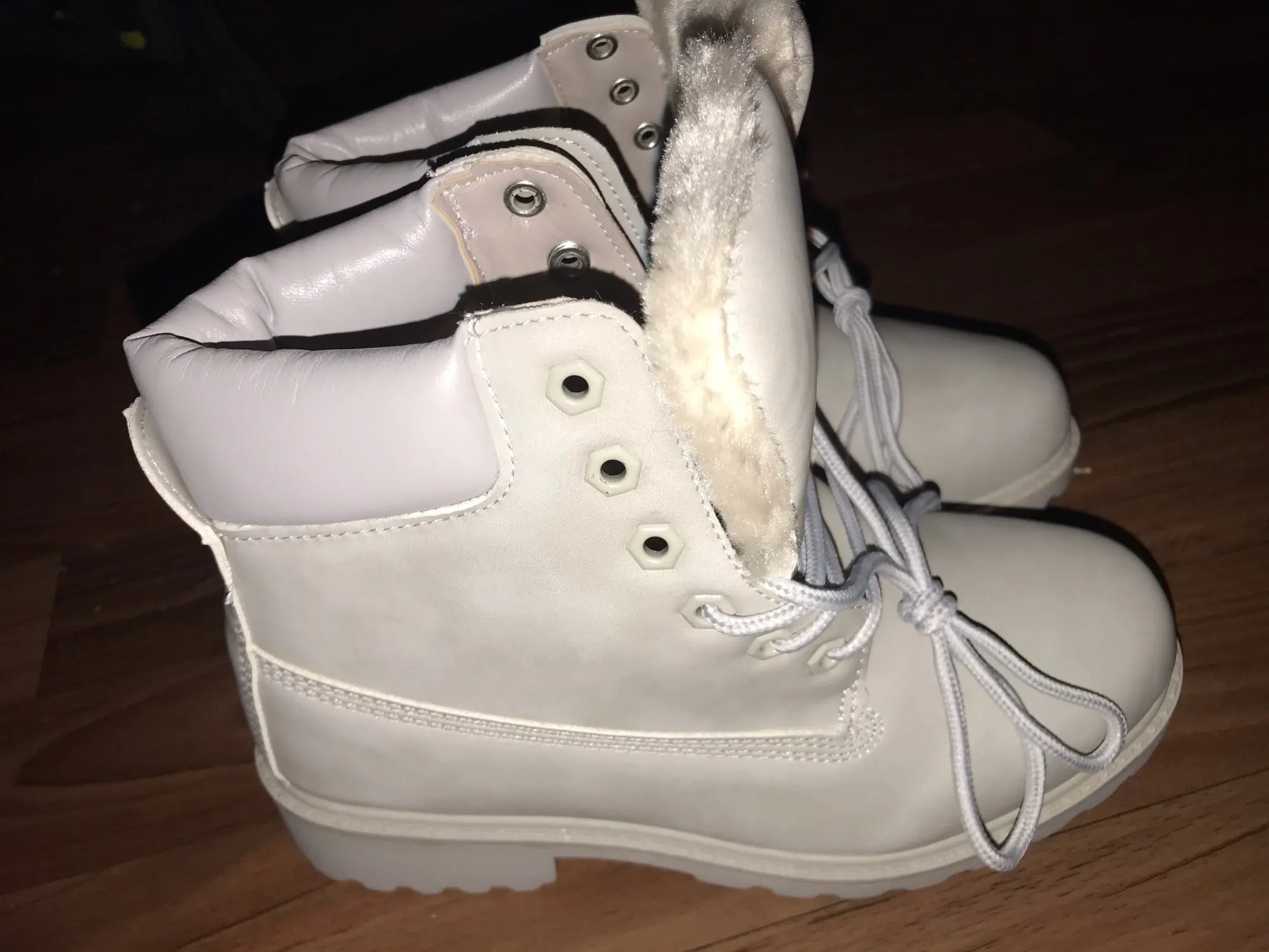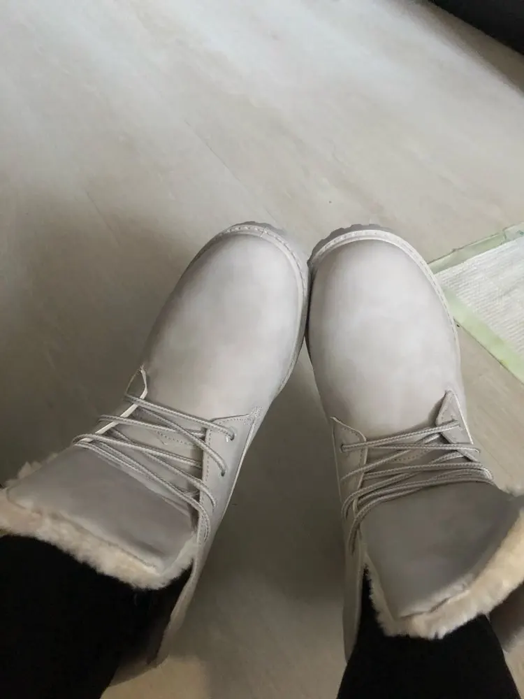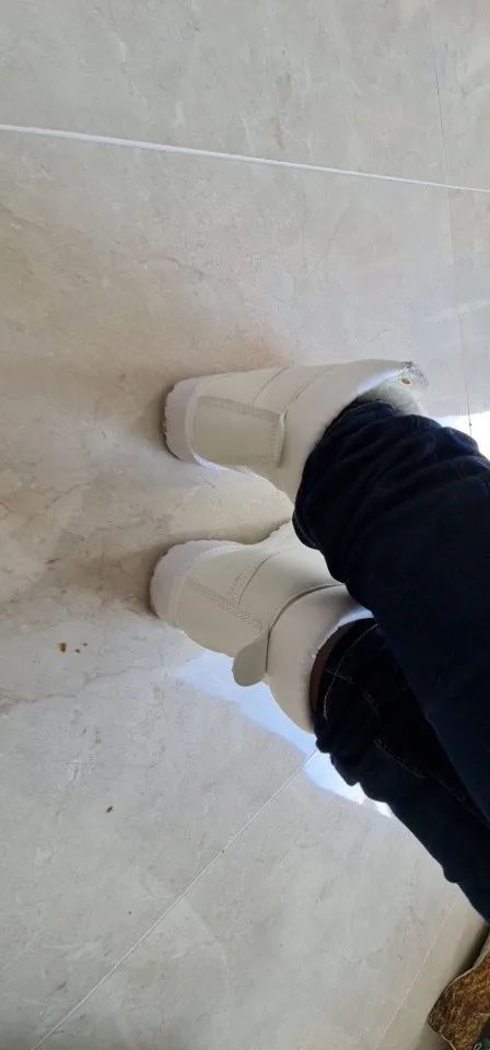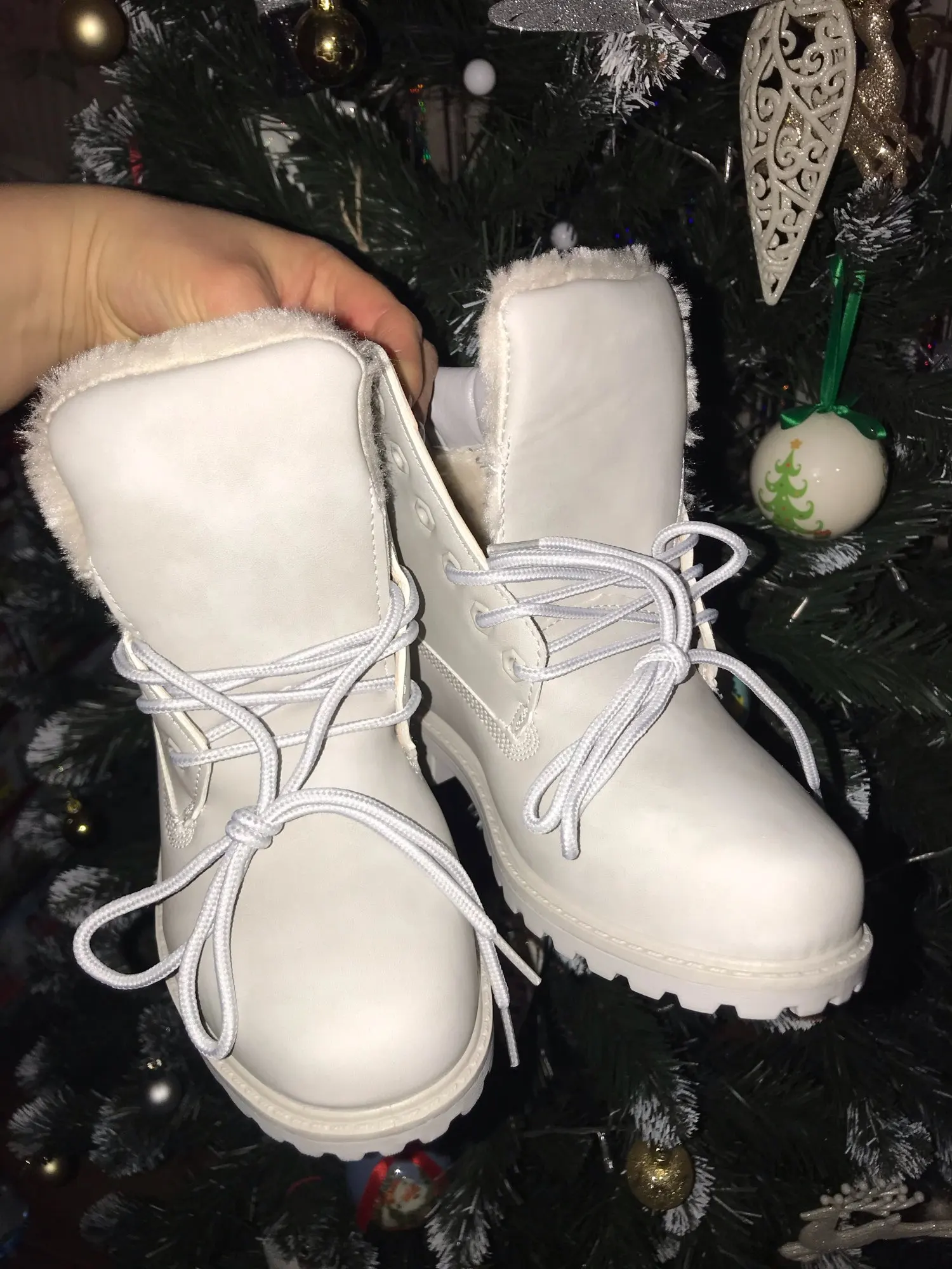 Товар очень хорошего качества, материал не трескается, ношу уже 2 недели, - 5 градусов у нас. Внутри теплые, но мех белый, а нарисован коричневый. Цвет у ботинок как на фото, бежевый, на щиколотке окантовка из тоненького кожзама, приятный материал. Пришли за 2,5 недели в рязань