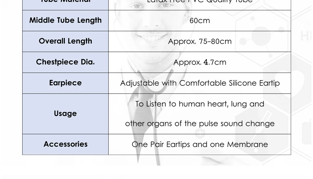 Этот стетоскоп из отличного медицинского материала с выдающейся акустикой. Нагрудные части и подвески для ушей изготовлены из цинкового сплава, что делает их прочными и долговечными. Полистерский наушник имеет хорошее уплотнение уха, что делает сердцебиение чистым и сильным.