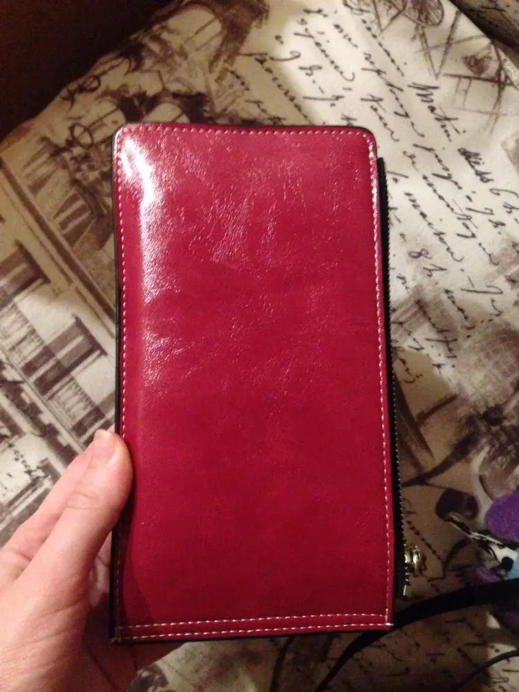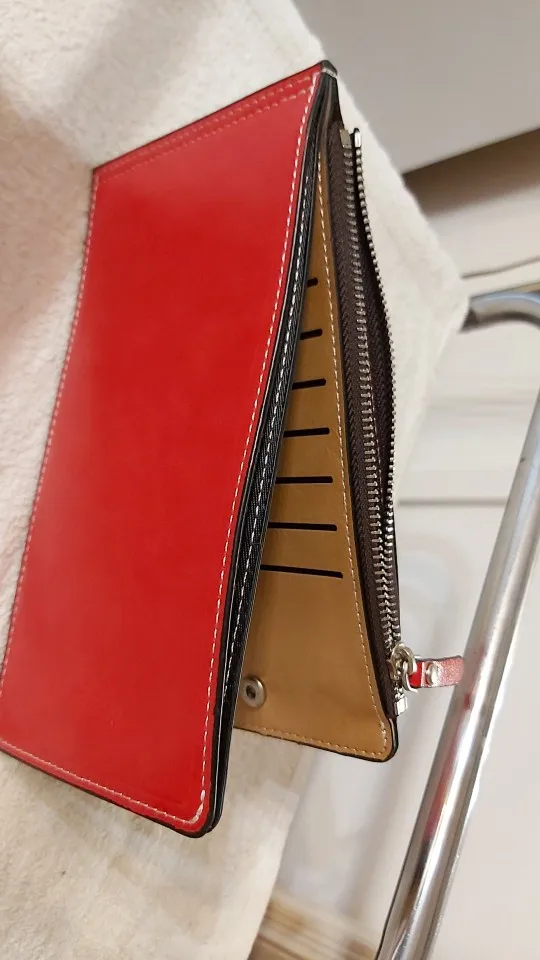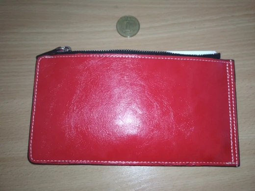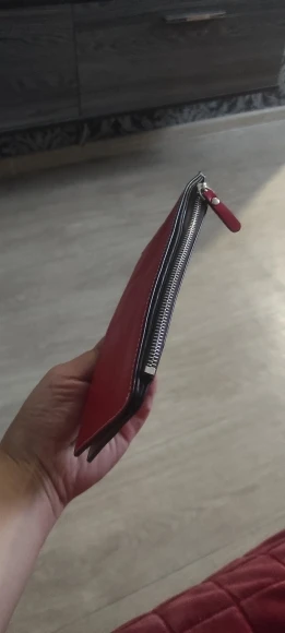 Доставка около месяца, посылку принес домой курьер Новой почты, что очень удобно. Кошелек насыщенного красного цвета, смотрится неплохо. Люблю чтобы всё было компактно, хотела тонкий функциональный кошелек и моё желание исполнилось. Есть 2 отделения: для купюр и для мелочи или телефона. Отделение на молнии использую для монет и визиток, карман достаточно глубокий, мелкие монетки бывает трудно извлечь, хотя можно перевернуть и высыпать всё. Отделение для банкнот внутри обшито нескользящей тканью, так что деньги не выпадают.