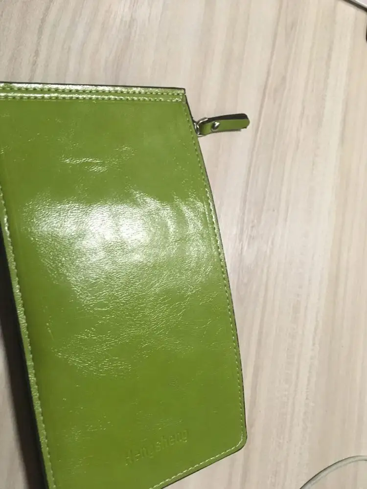 Пришло за 3 недели в Украину. Цвет отличается сильно, зелёный ближе к темно-фисташковому. Влазит 16 карточек пластиковых. Остальные, редко используемые, положила в отделение с молнией. Качество хорошее, но не кожа.