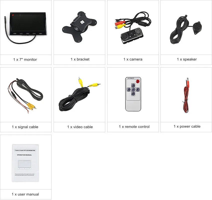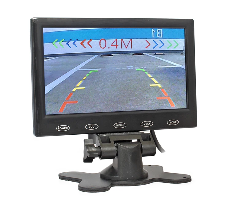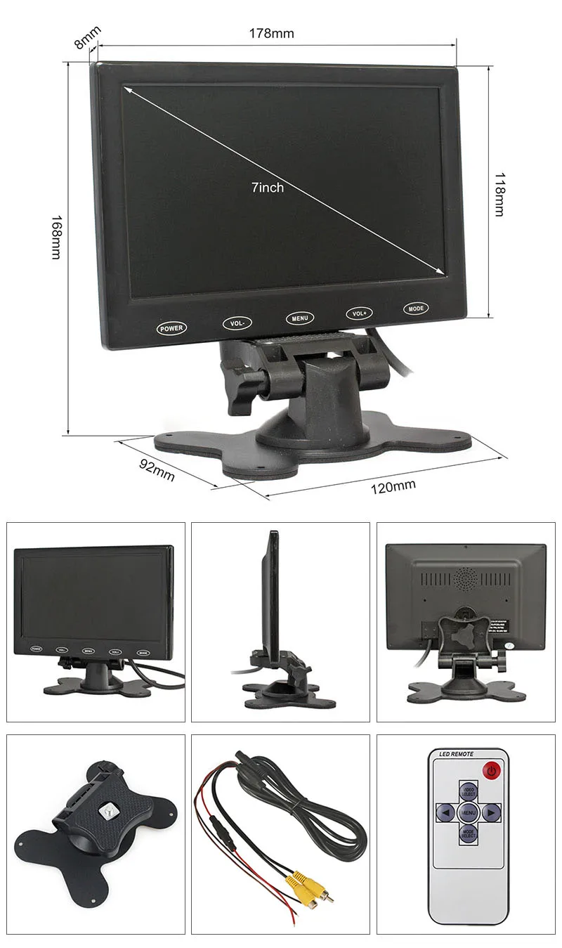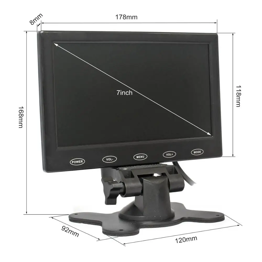 Размер экрана: 7 дюймов Режим отображения: 16 : 9 Система: PAL / NTSC (Авто) Разрешение: 800 (в) x 480 (В) Номинальное напряжение:12V-24V DC Потребляемая мощность: 3 Вт Способ управления: сенсорная кнопка и пульт дистанционного управления Вход Vedio: двусторонний видеовход Рабочая температура: -20° C-60° C Температура хранения: -40° C-60° C Яркость: 250 кд/м2; Контраст: 300:1