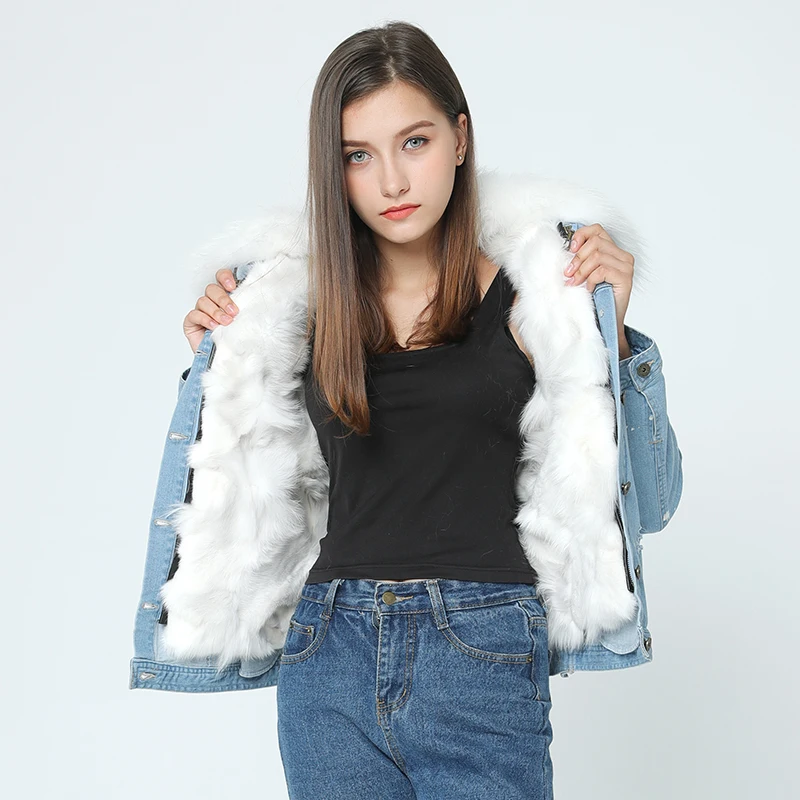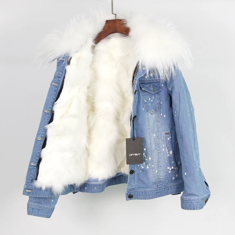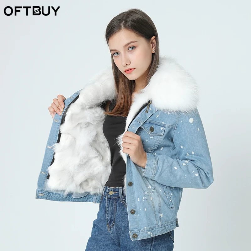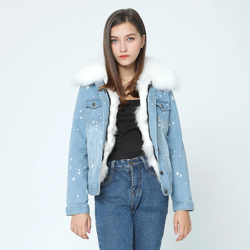 Бренд 2021, осенне-зимняя куртка, пальто, женская джинсовая куртка с дырками, большой воротник из меха енота и натуральный Лисий мех, Толстая теплая подкладка
