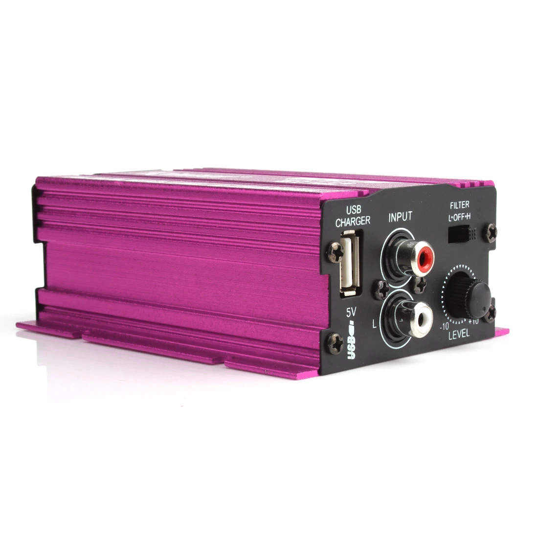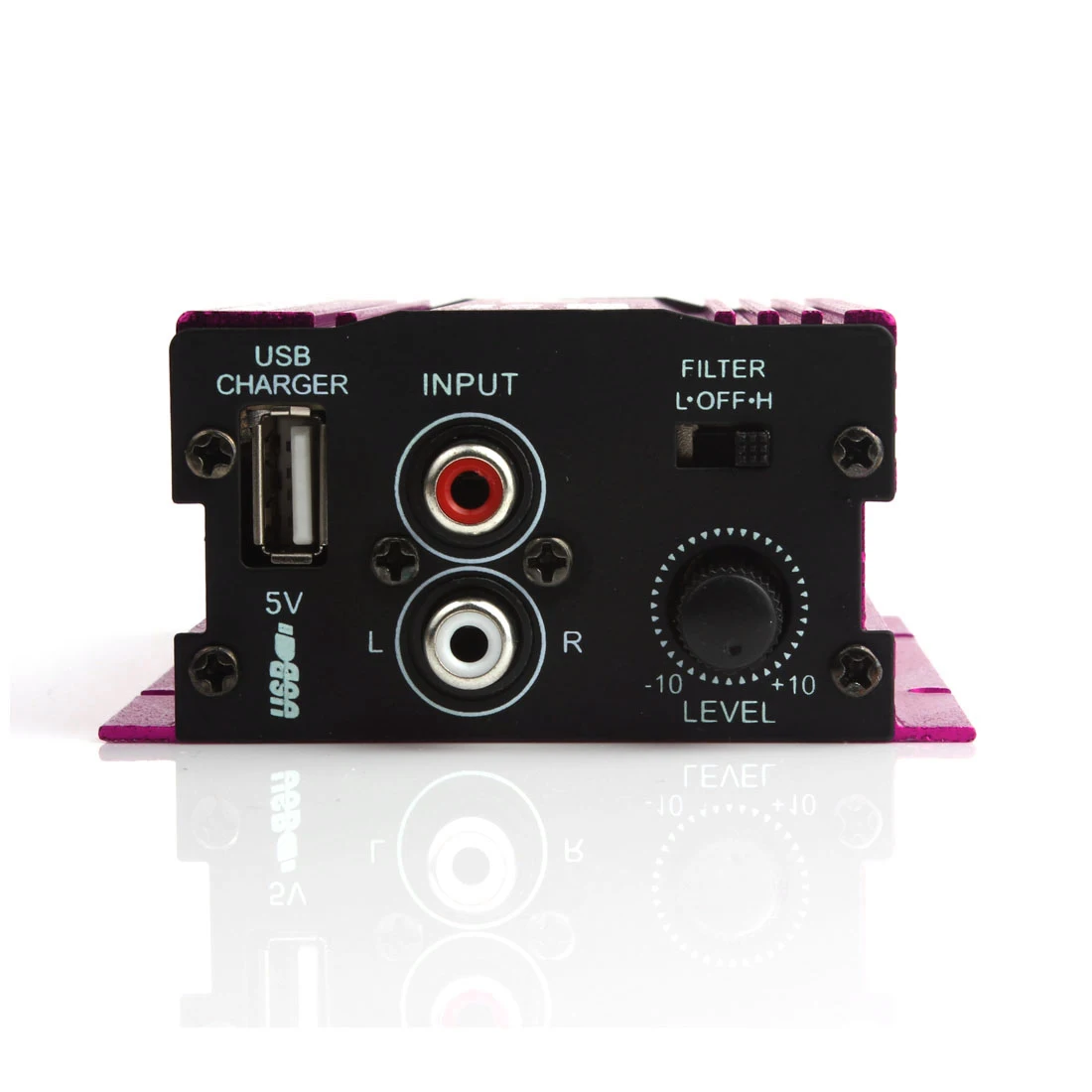 -Usb-порт для зарядки, входной разъем RCA L / R, переключатель фильтра низкого/выключения/пропуска и регулятор громкости на правой стороне.