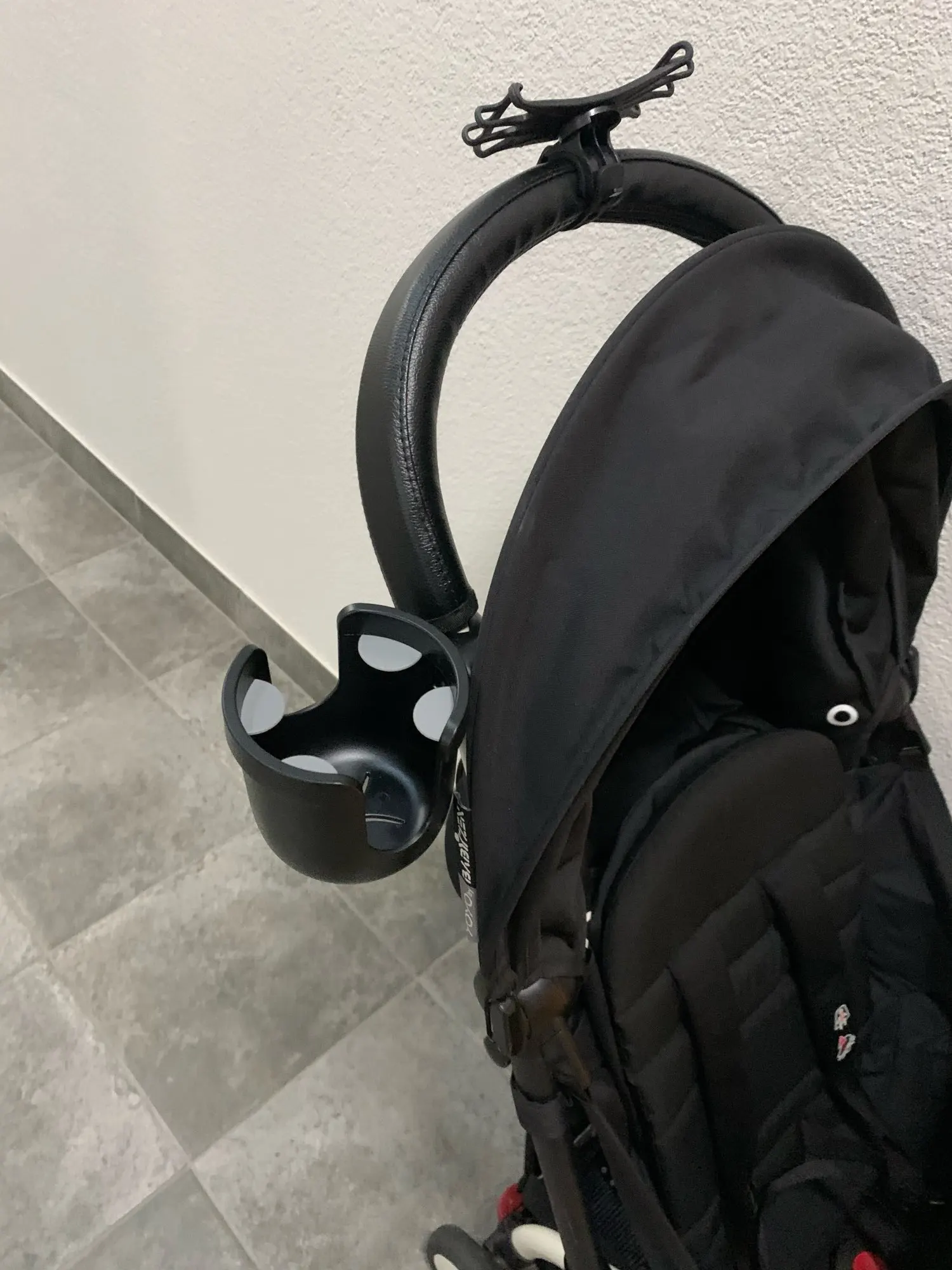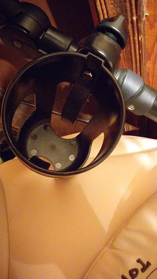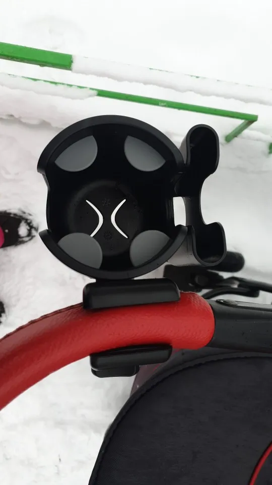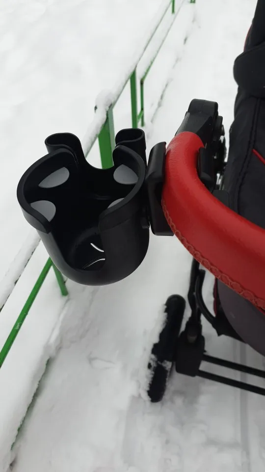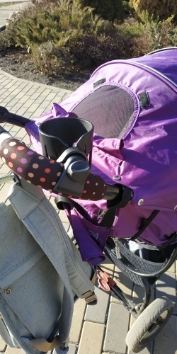 подстаканник очень удобный. немного лучше оригинального, который я сломала. на ручке коляски держится хорошо. стакан и бутылка влезают прекрасно. очень довольна покупкой.