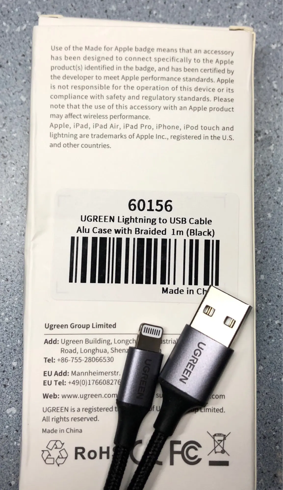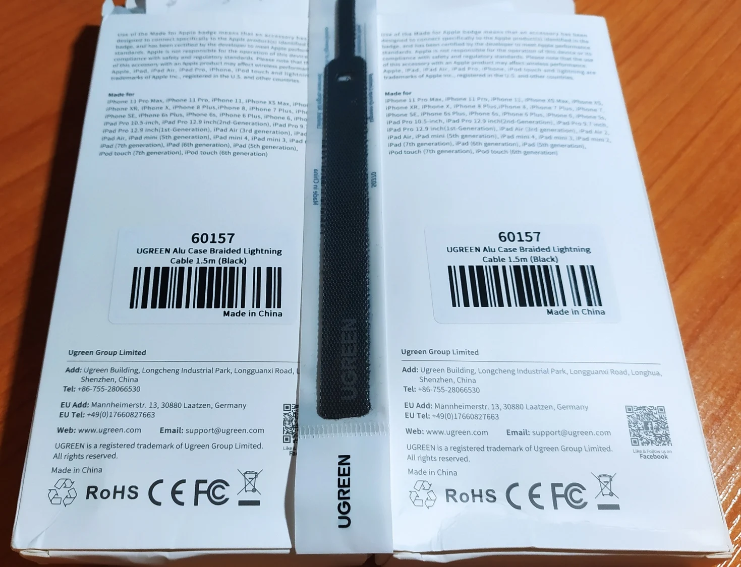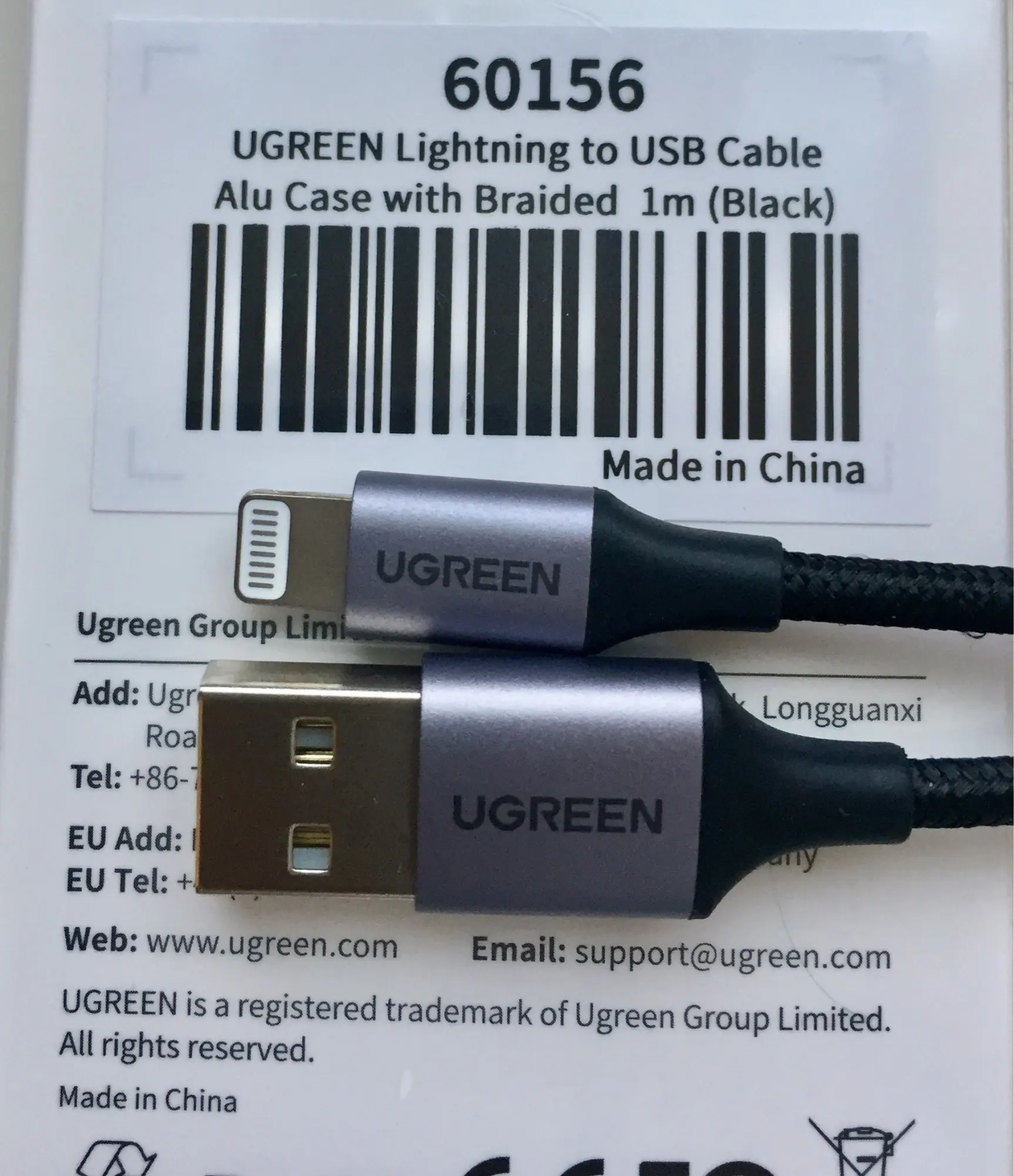 Заказано 13.11, отправлено 15.11, пришло 11.12, потому что выбрал доставку "Пятёрочкой", а они собирали 4 заказа и получилось дольше, чем почтой. Странно, на сайте компании этой модели нет, модель 60157 среди MFi-сертифицированных есть аж 4 штуки, но поскольку UPC/EAN нигде не найти, конкретно этот провод не проверить. Но зарядку 2,4 А от сети даёт (12,26 Вт), даже от ПК 1,8 А / 8,3 Вт (USB 3.0), с компом коннектится. Длина кабеля 1,5 метра, качество изготовления на высоте. Зная репутацию UGREEN - 5 баллов за кабели. В подарок на 2 кабеля положили одну липучку и предложение скидки. Дополню, если что-то случится.