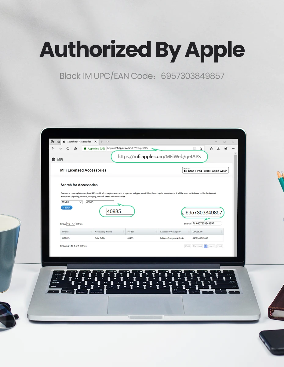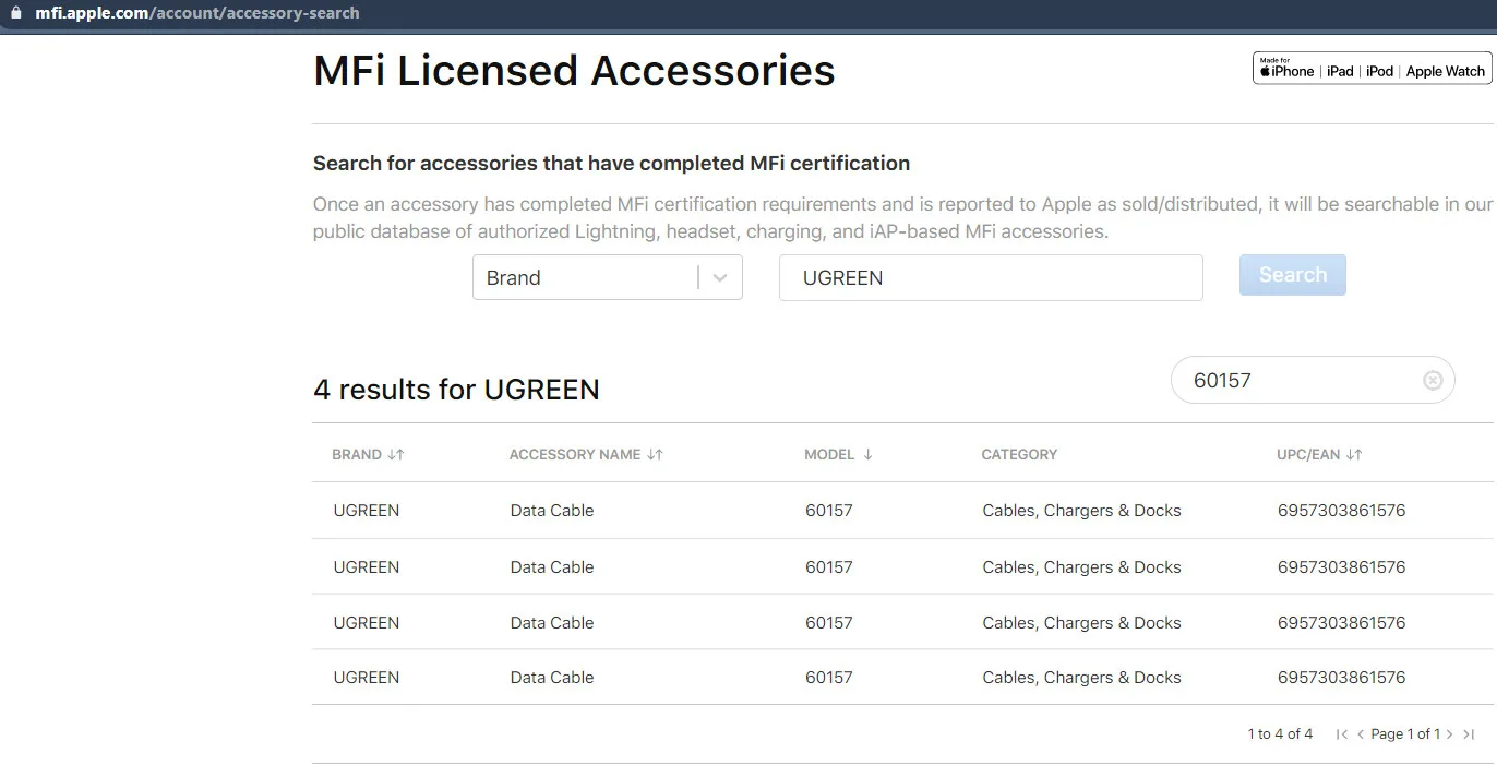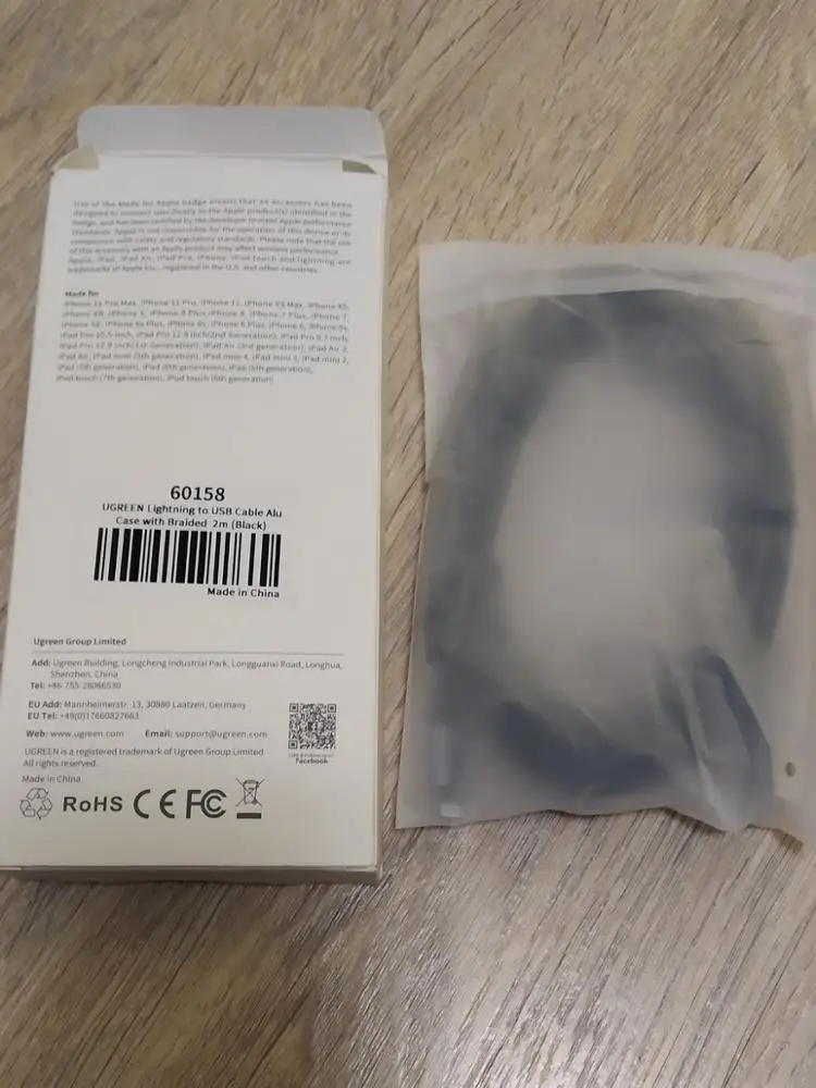 Заказано 13.11, отправлено 15.11, пришло 11.12, потому что выбрал доставку "Пятёрочкой", а они собирали 4 заказа и получилось дольше, чем почтой. Странно, на сайте компании этой модели нет, модель 60157 среди MFi-сертифицированных есть аж 4 штуки, но поскольку UPC/EAN нигде не найти, конкретно этот провод не проверить. Но зарядку 2,4 А от сети даёт (12,26 Вт), даже от ПК 1,8 А / 8,3 Вт (USB 3.0), с компом коннектится. Длина кабеля 1,5 метра, качество изготовления на высоте. Зная репутацию UGREEN - 5 баллов за кабели. В подарок на 2 кабеля положили одну липучку и предложение скидки. Дополню, если что-то случится.