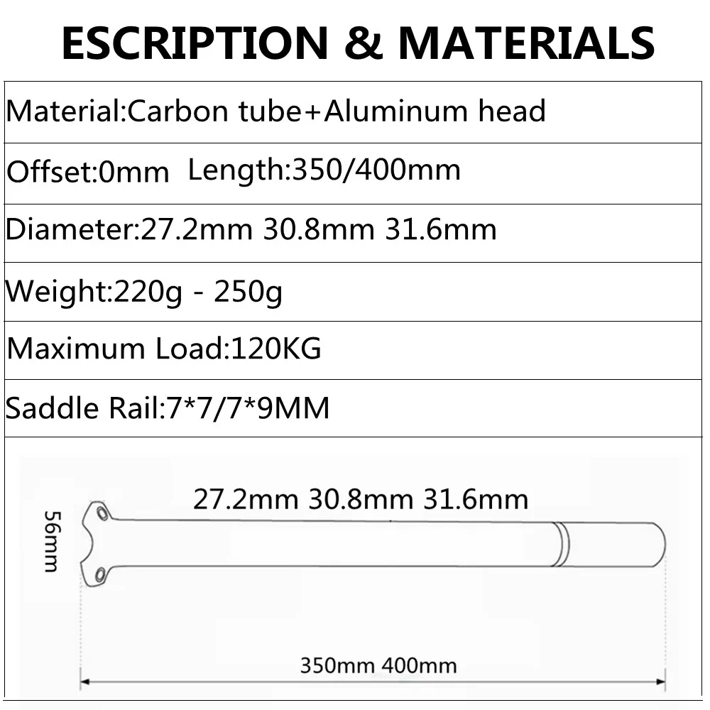 Подседельный штырь для велосипеда, из углеродного волокна, Диаметр 27,2 мм, 30,8 ММ, 31,6 мм, длина 350 мм, 400 мм, 450 мм