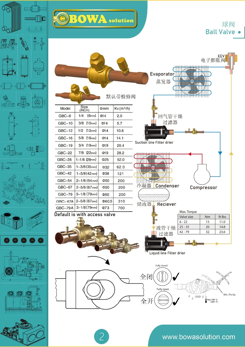 Шаровые краны управляются вручную, запорные клапаны подходят для двунаправленного потока. Все клапаны используются в жидких, всасывающих и горячих газовых линиях в системах охлаждения, замораживания и кондиционирования воздуха. Двунаправленный шаровой кран GBC может быть доставлен с или без внешнего порта доступа. Клапаны имеют цельный уплотнительный колпачок для предотвращения непреднамеренного удаления крышки или взлома между услугами.