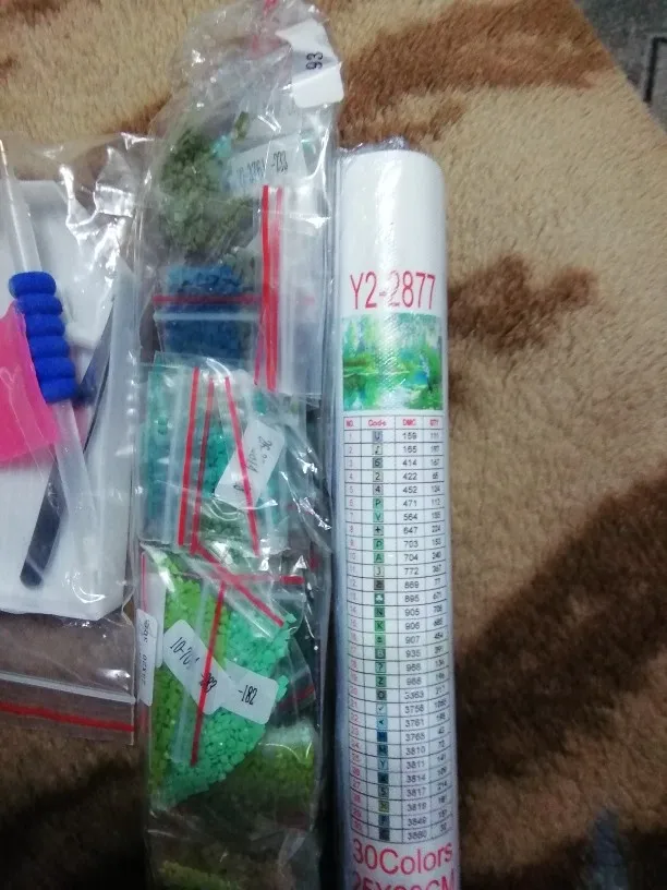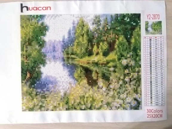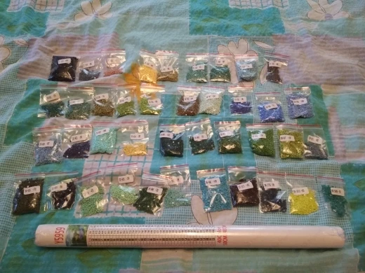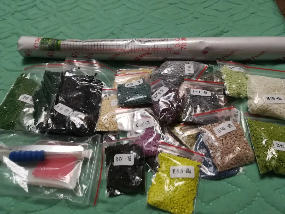 Комплект в порядке, по номерам все сходится. Дополнительно включён лоточек для страз, гель, пинцет и стилус с несколькими насадками. Слегка огорчило, что нет распечатки с кодировкой отдельным листом. Это достаточно неудобно, когда выполняешь масштабную работу больше 30*40.В остальном все радует. Упаковано было отлично. При транспортировке риск повредить полотно минимален. Доставка комплекта заняла около 14 дней