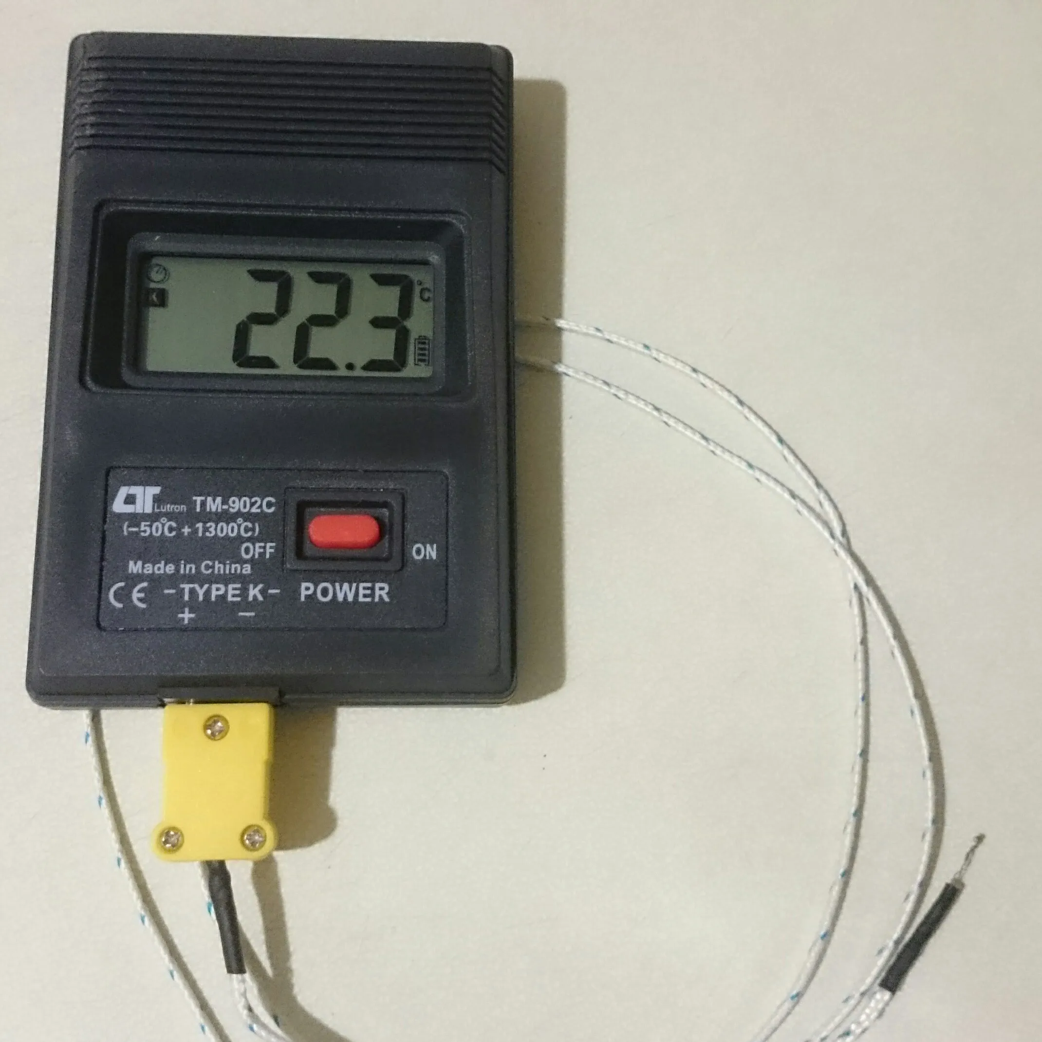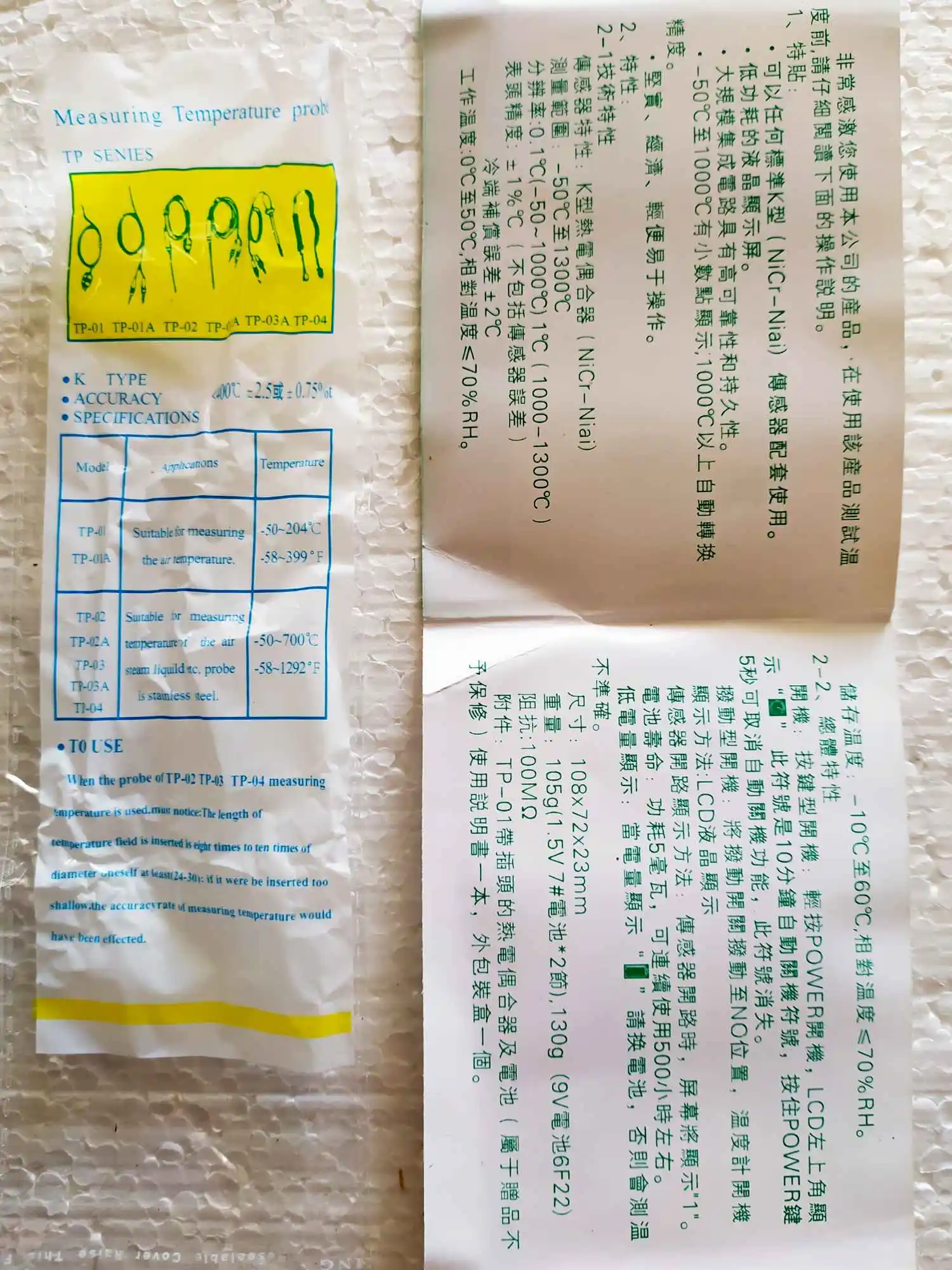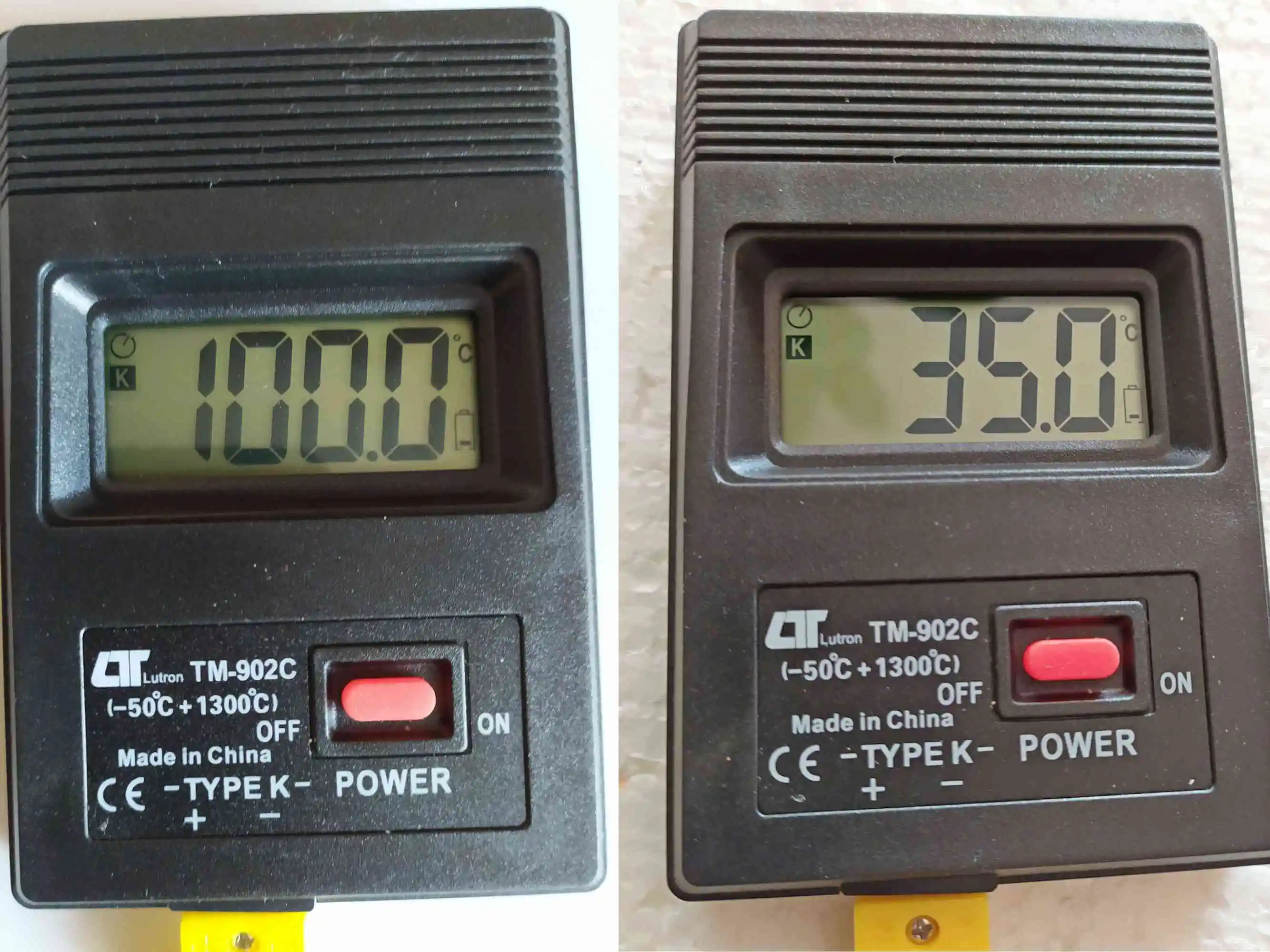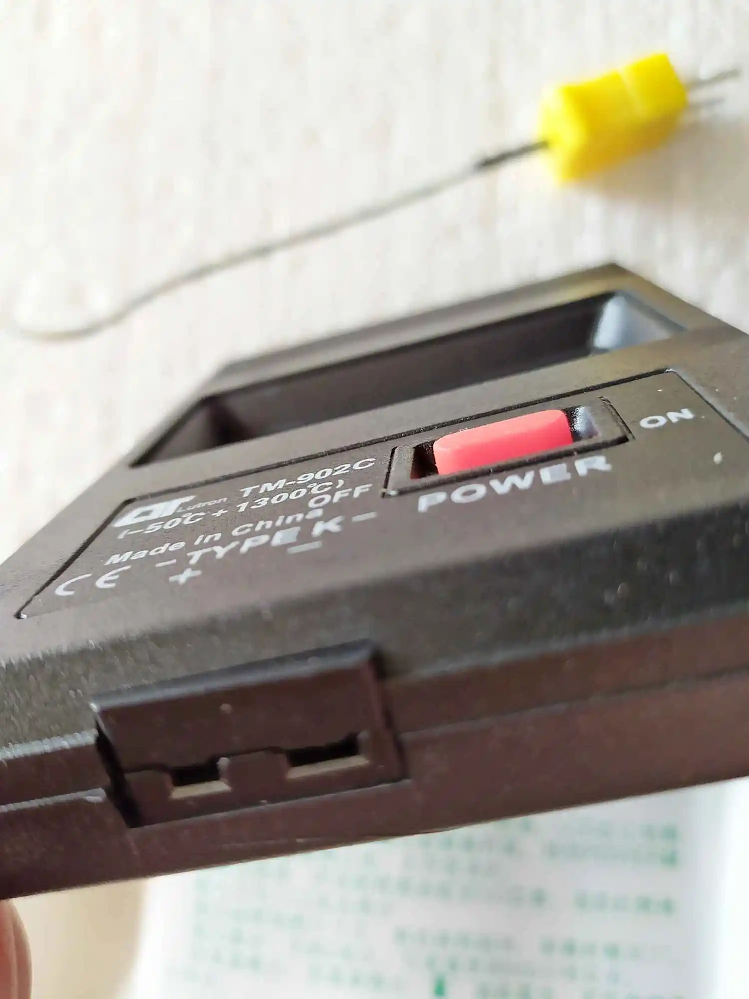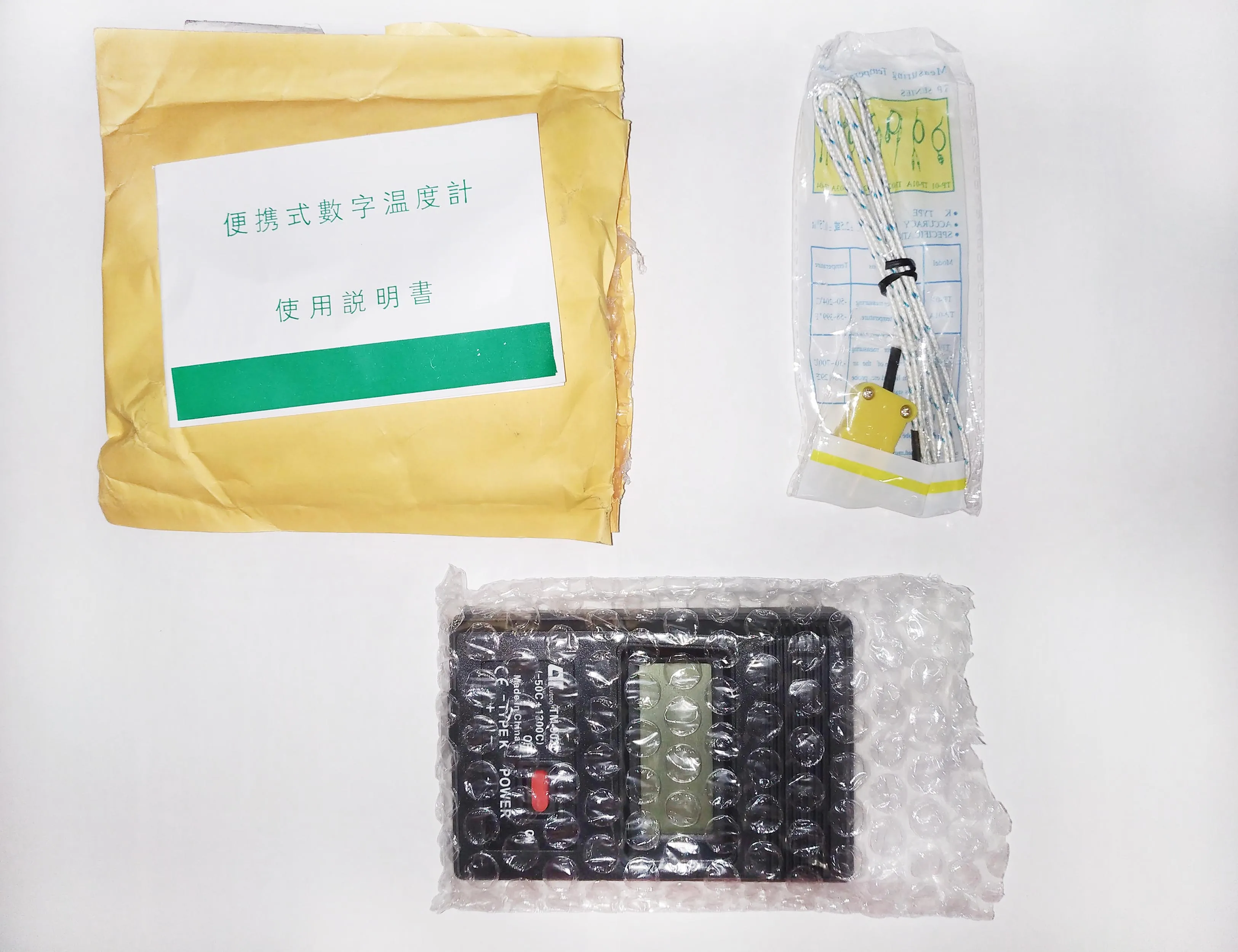 Доставлено за три недели в консолидированной посылке. Очень нравится такой способ доставки - все цело и даже маленькие пакеты не пропадают. Упаковано в пупырку. Батареек нет. Соединение с датчиком полярное. Есть инструкция на китайском; из информации на пакетике с датчиком узнал, что он самый простой TP-01 (до 204 градусов). Есть более продвинутые датчики, расширяющие возможности этого прибора до 700 градусов. Замерил показания (см. на фото) - в чайнике ровно 100 градусов, у меня на губах - 35 всего. Доволен покупкой и продавцом. Спасибо.