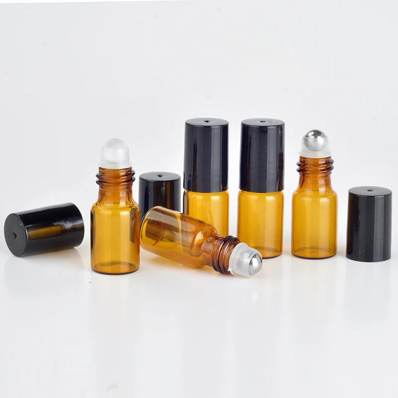 Оптовая продажа 100 шт.лот 3 мл рулон на портативный Янтарный стеклянный многоразовый флакон для духов пустой чехол для эфирного масла с пластиковой крышкой