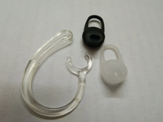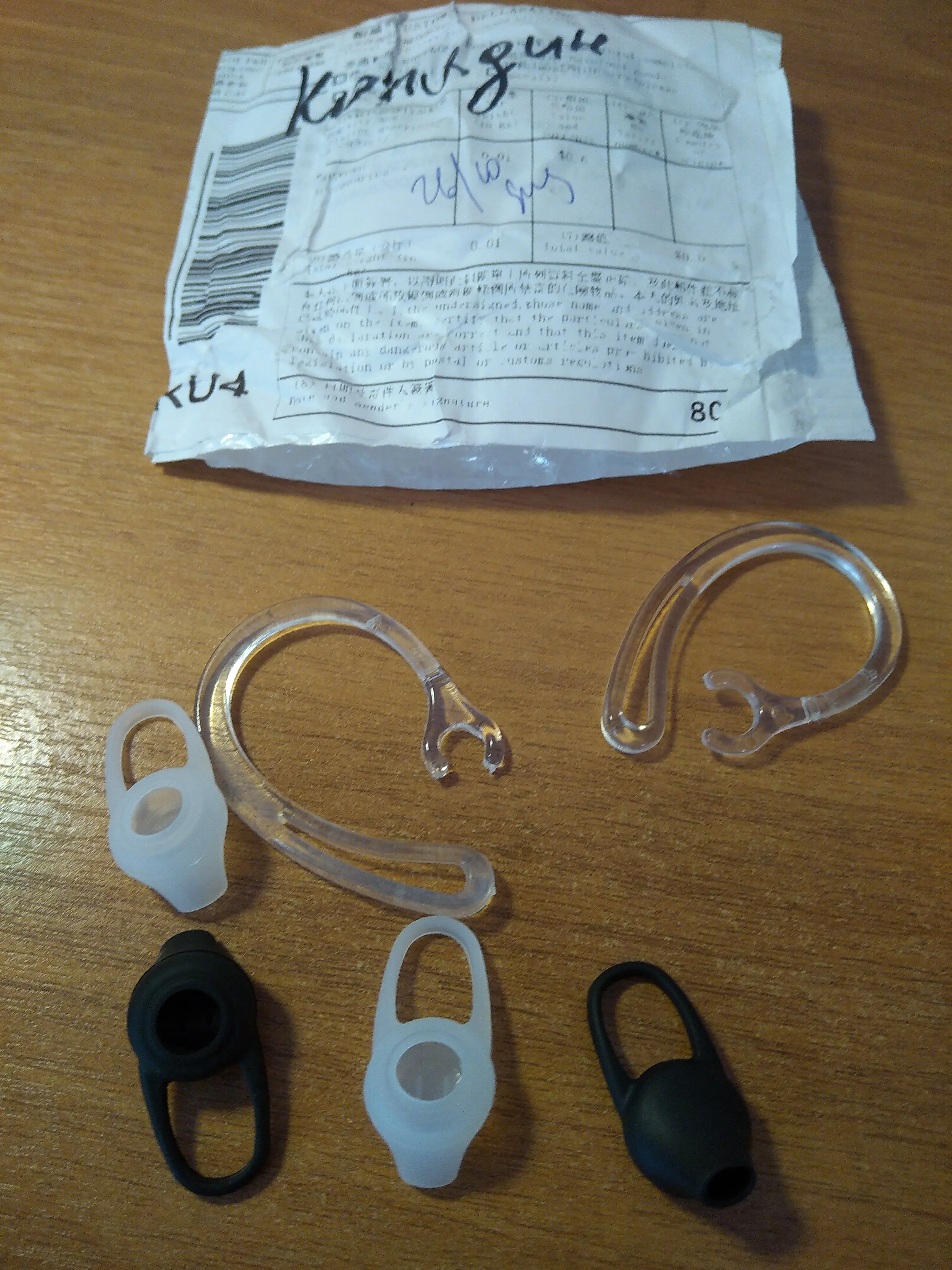 Продавцу спасибо. Пришло все быстро. В комплекте два силиконовых амбушюра (белый и черный) и один крючок на ухо. Место крепления к гарнитуре или наушнику жесткий пластик (у меня именно в этом месте треснули два "родных" от гарнитуры). Сам крючок на ухо достаточно гибкий силикон или пластик.