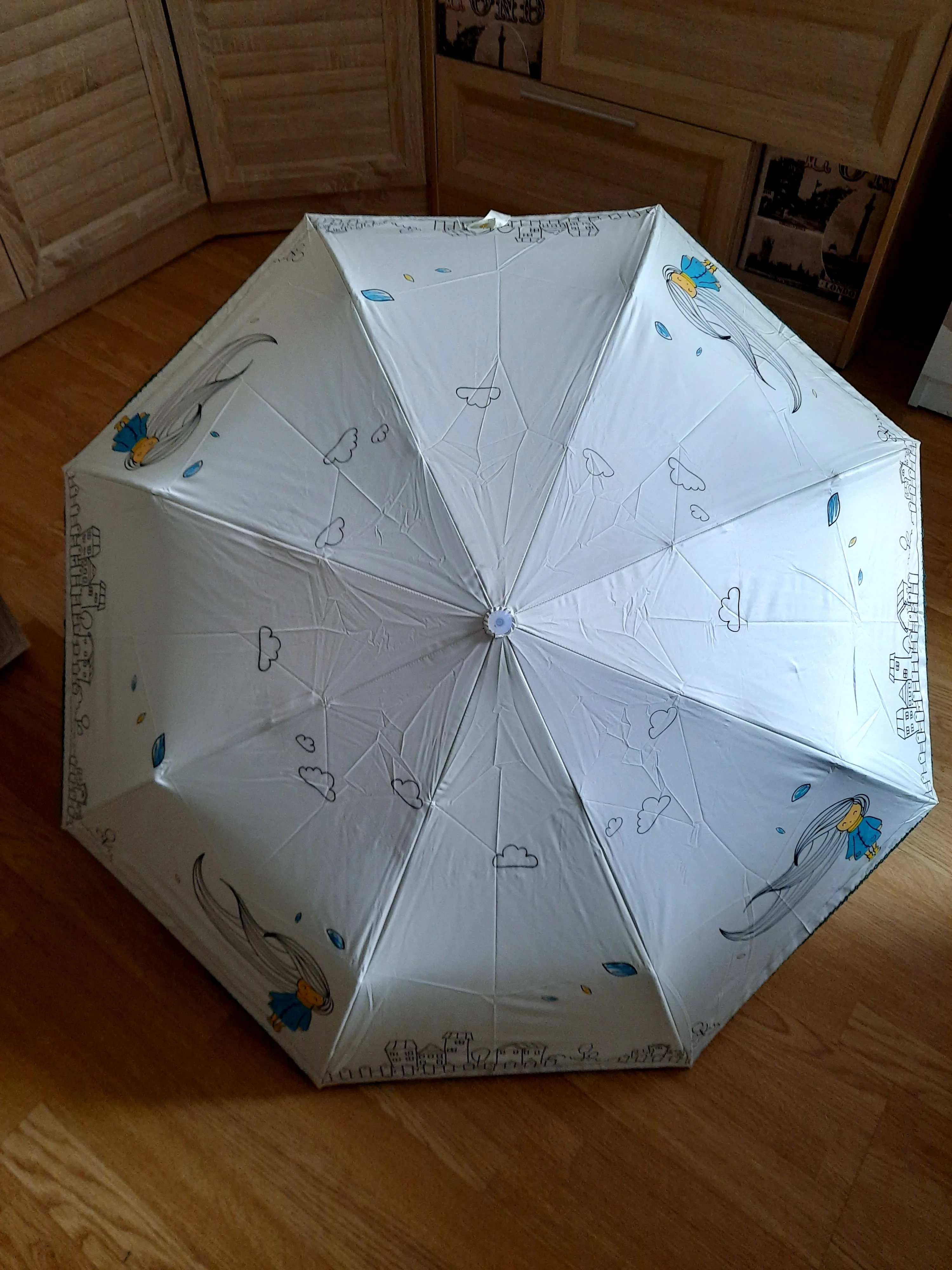 Зонтик - супер! Супер качество. Цвет белый, ткань даже чуток перламутровая! А ручка матовая! Механизм работает отлично! Это самая быстрая доставка, при чем на дом!
