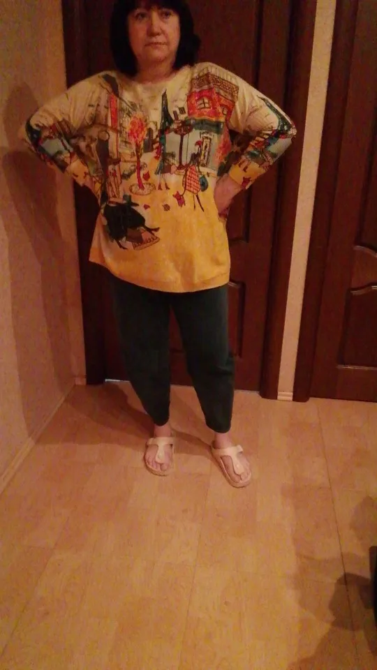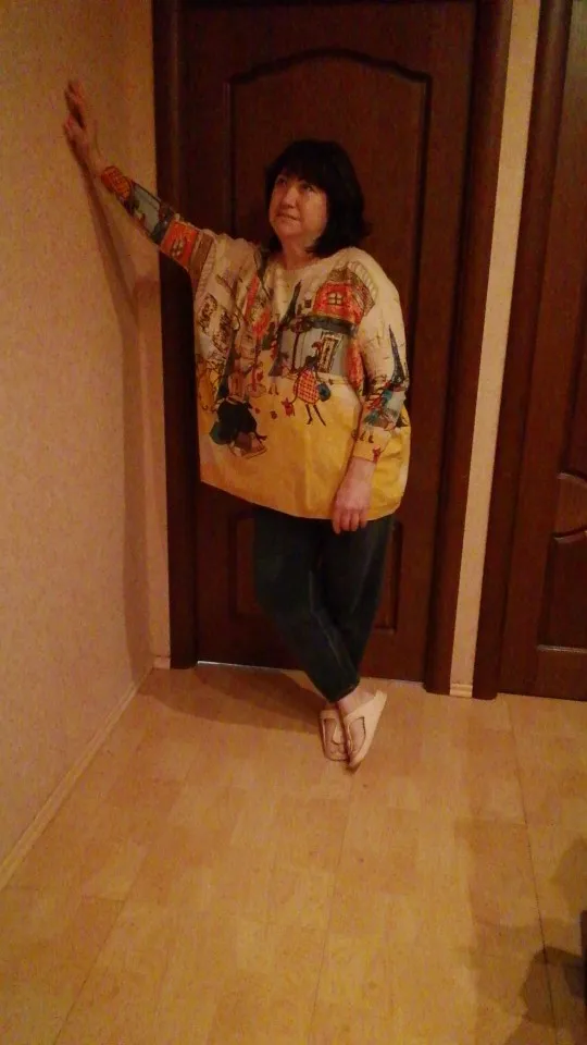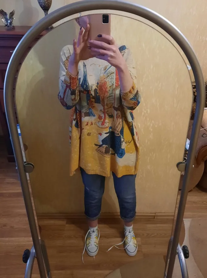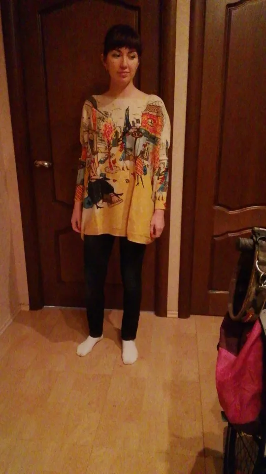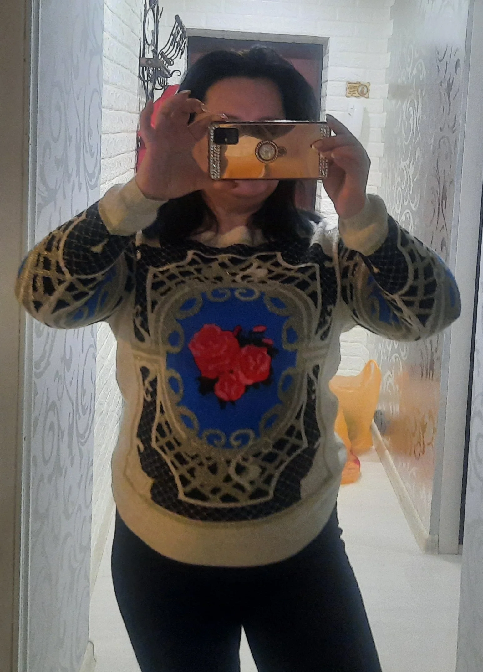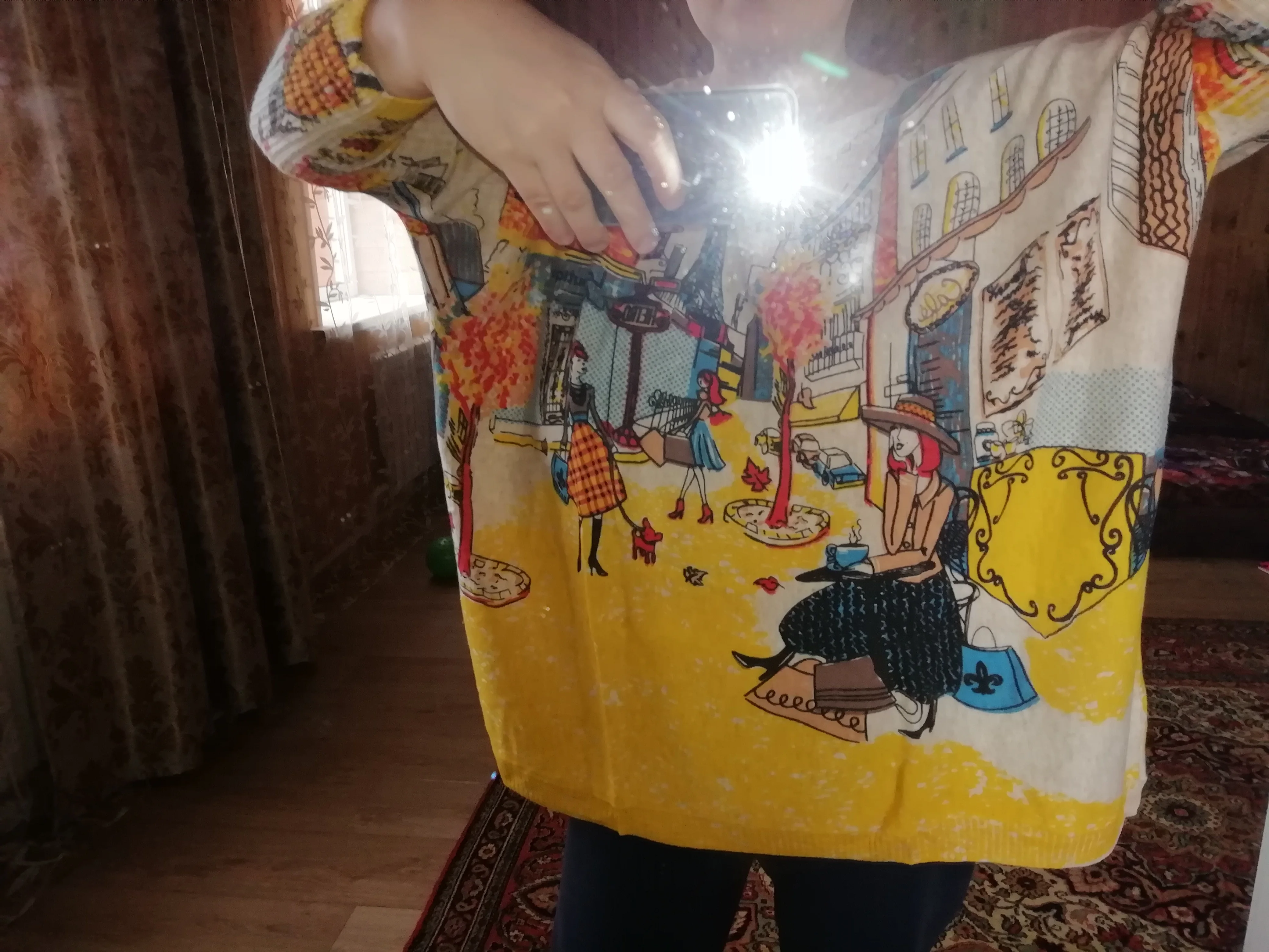 неплохой джемперок. но на мне уж кажется слишком оверсайз. длина до середины бедра. продавнц положил в подарок еще другой джемперок с розами - отдала маме